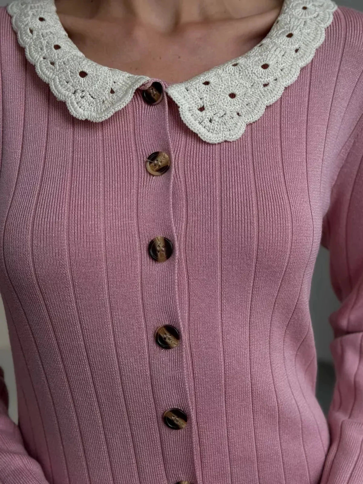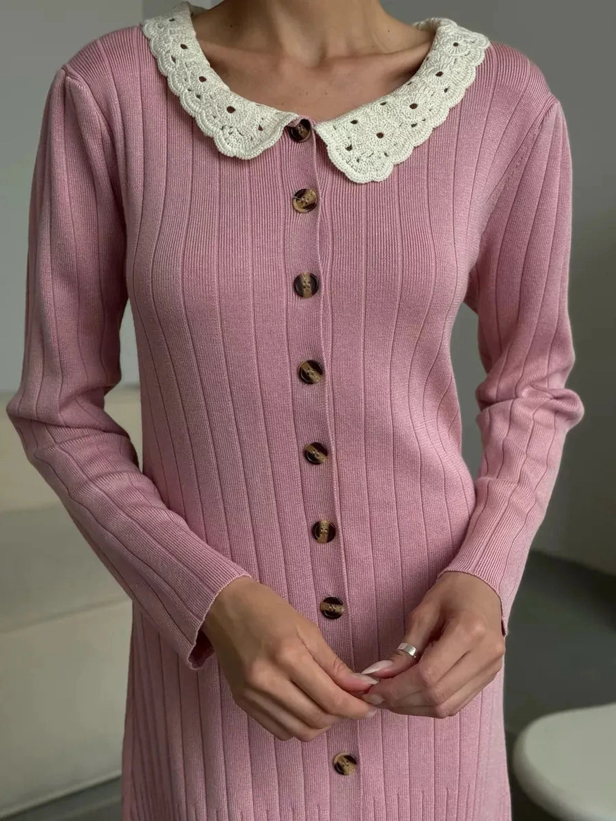 Amelie Midi Dress — Ribbed Knit Maxi Dress with Lace Collar and Button Front