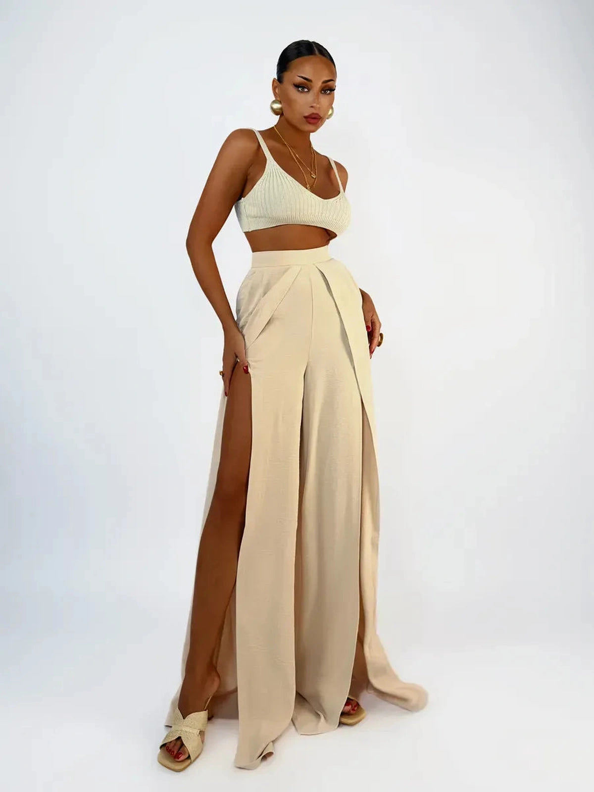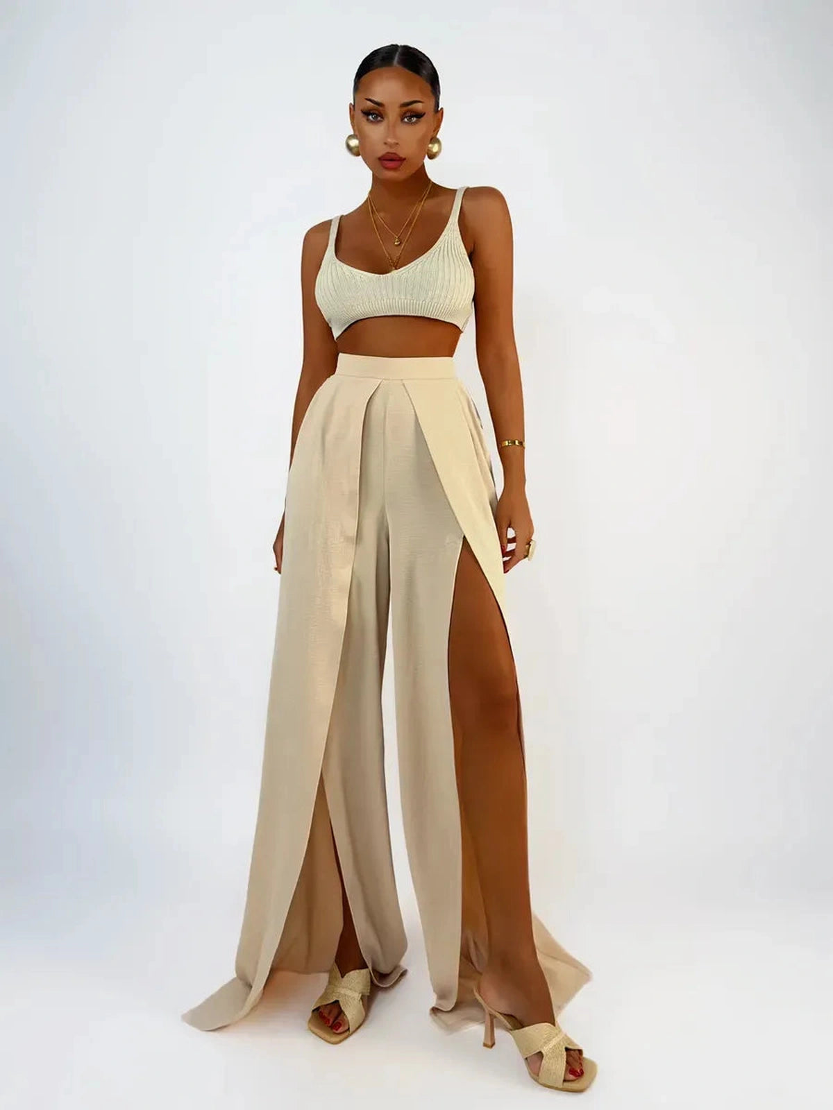 Introducing the Aurelia Pants, a refined choice for the modern woman seeking style and comfort. These wide-leg palazzo trousers feature a high waist that sculpts and elongates the silhouette, offering a flattering and sophisticated look. The elegant front slits add movement and a chic touch, making them perfect for summer events and evening occasions.