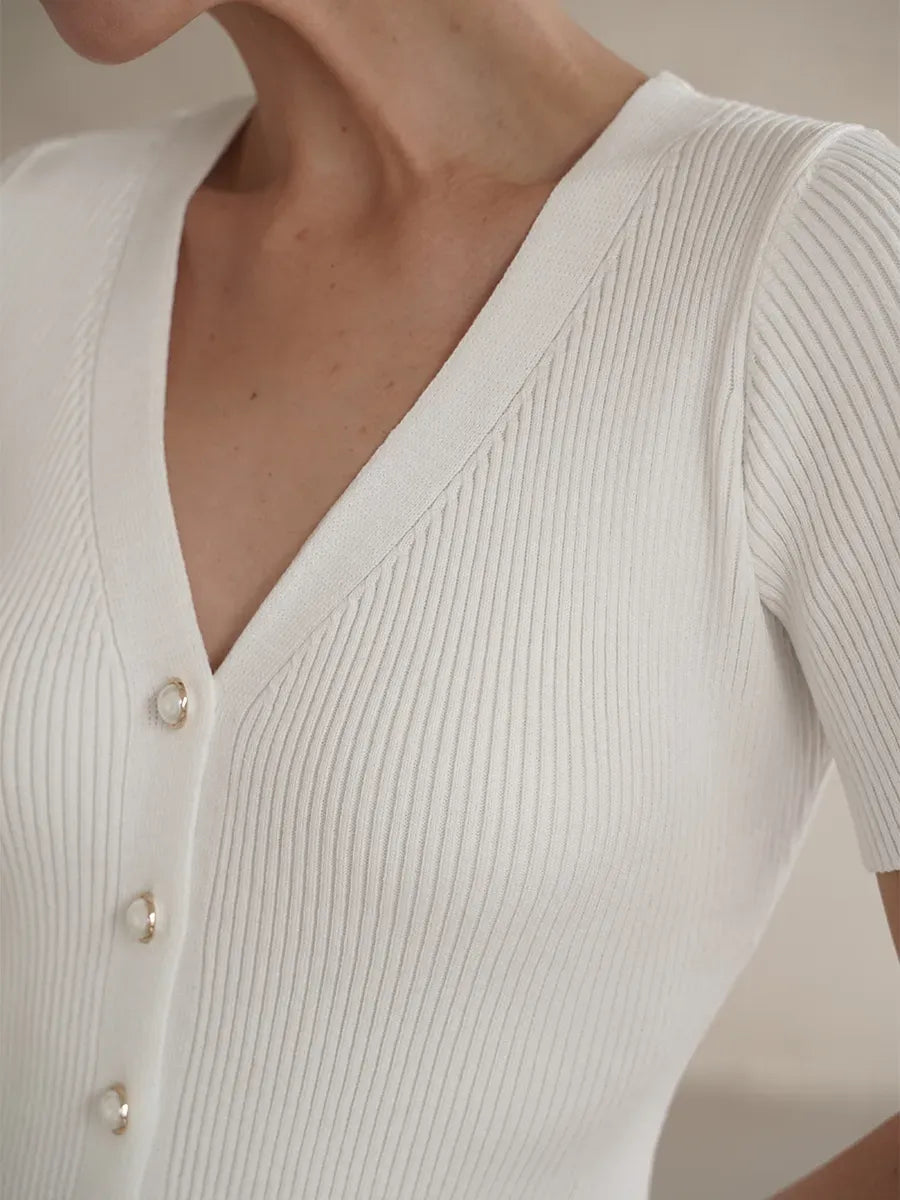 The Aurora Midi Dress redefines effortless luxury with its refined silhouette and timeless design. Crafted from a soft viscose-blend knit, this milk-white dress contours the body with a sleek, sculpted fit. The deep V-neckline and pearl-style button closure add a touch of sophistication and sensuality, making it a perfect choice for both elegant evenings and modern daywear.