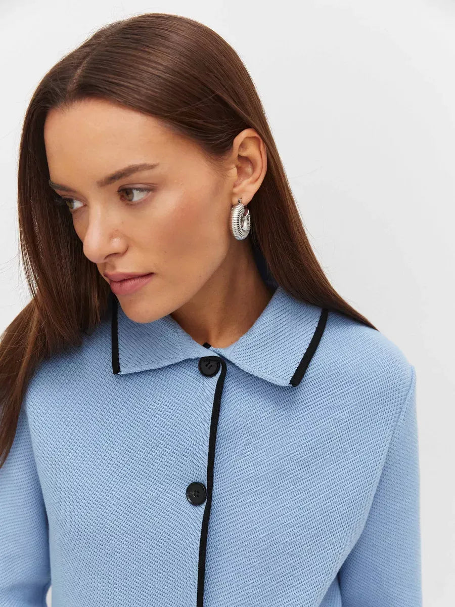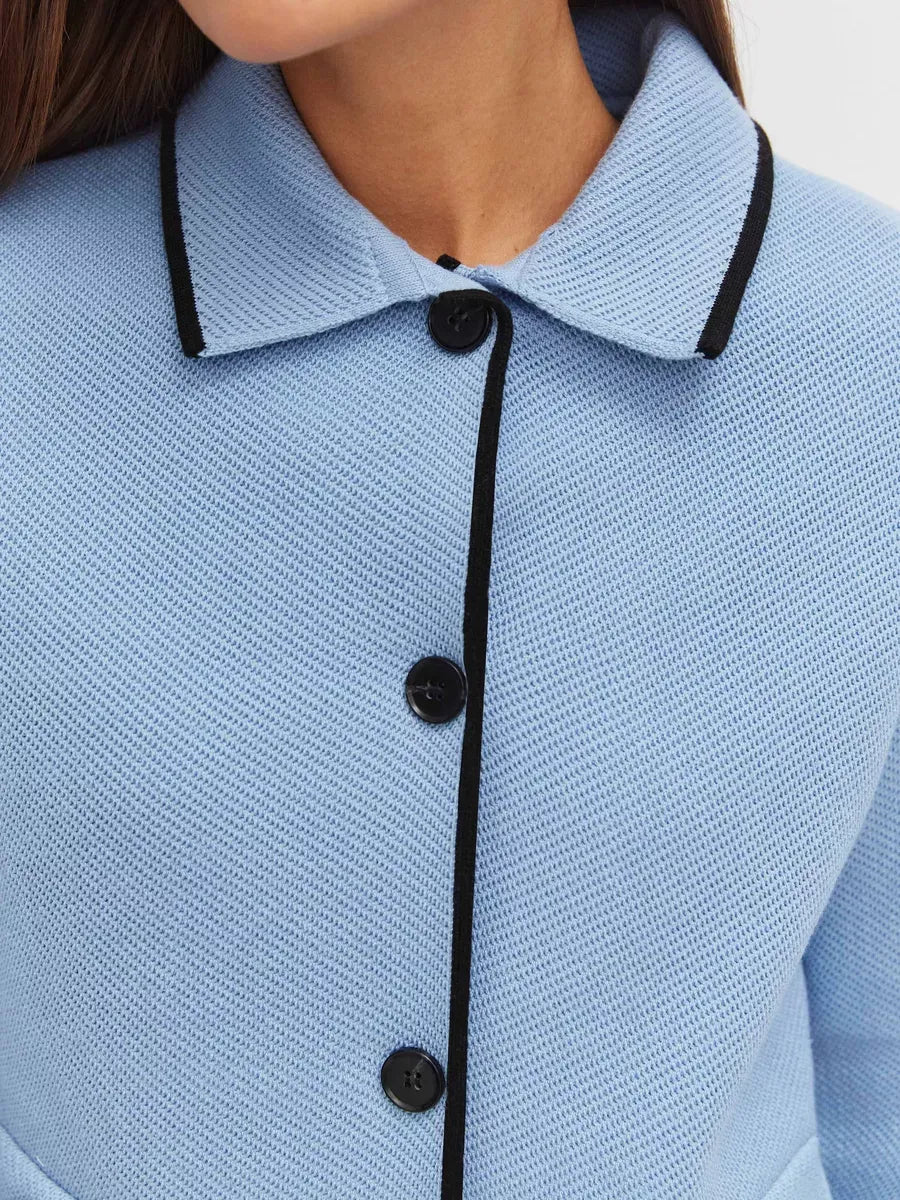 The Azura Jacket offers a fresh take on classic elegance with its light blue hue and sharp contrast detailing. Made from a premium cotton-viscose blend, this women’s blazer delivers a soft, breathable feel combined with tailored structure. The cropped silhouette and black piping along the collar and button placket enhance its modern appeal.
