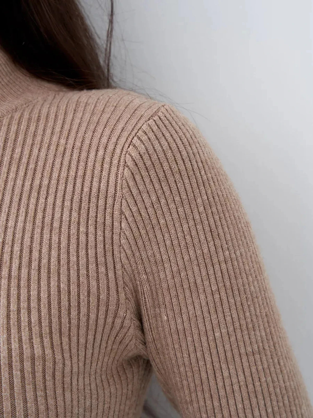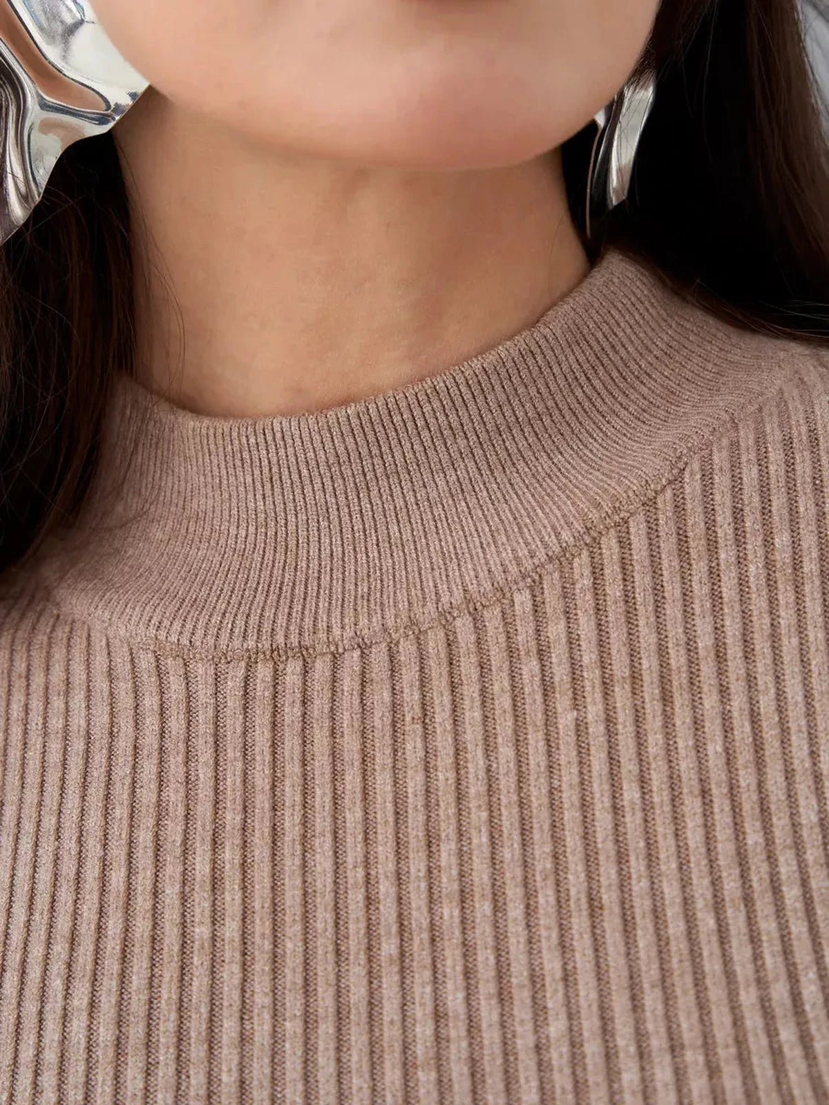 The Celeste Midi Dress is a refined winter wardrobe essential, crafted to offer both warmth and sophisticated style. Made from a plush blend of viscose, polyester, nylon, and cashmere, this ribbed knit dress delivers cozy comfort with a flattering slim fit silhouette. Its elegant cappuccino tone brings a rich, understated charm ideal for a variety of occasions.