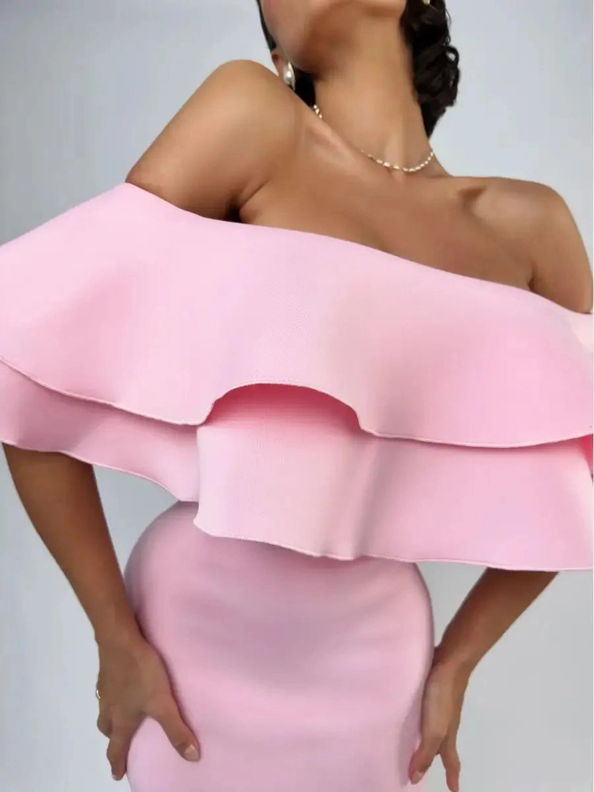 Elevate your evening wardrobe with the Celeste Midi Dress, a refined and elegant piece designed to highlight your silhouette with sophistication. This women's midi dress features an off-shoulder bando neckline adorned with layered ruffles, delivering a playful yet chic statement that enhances your natural grace. Crafted from a breathable fabric blend with a comfortable stretch, this fitted dress promises an impeccable fit and timeless appeal.