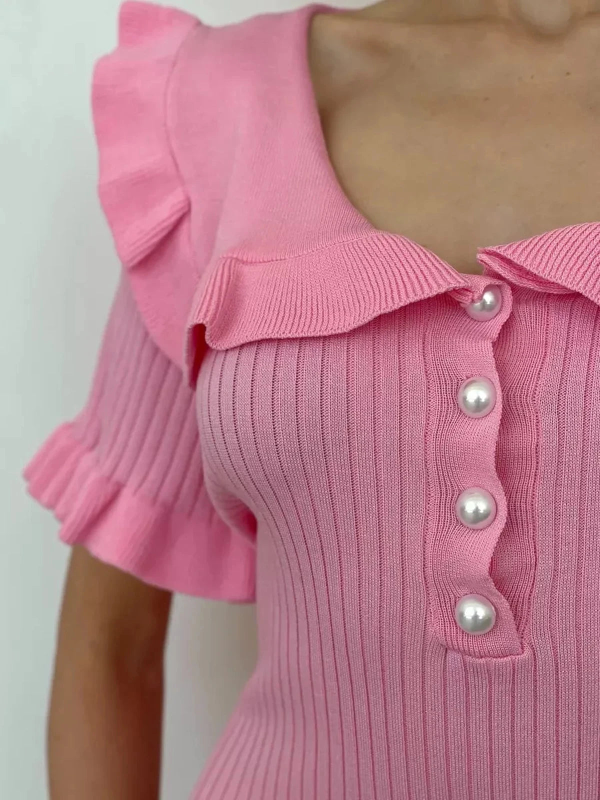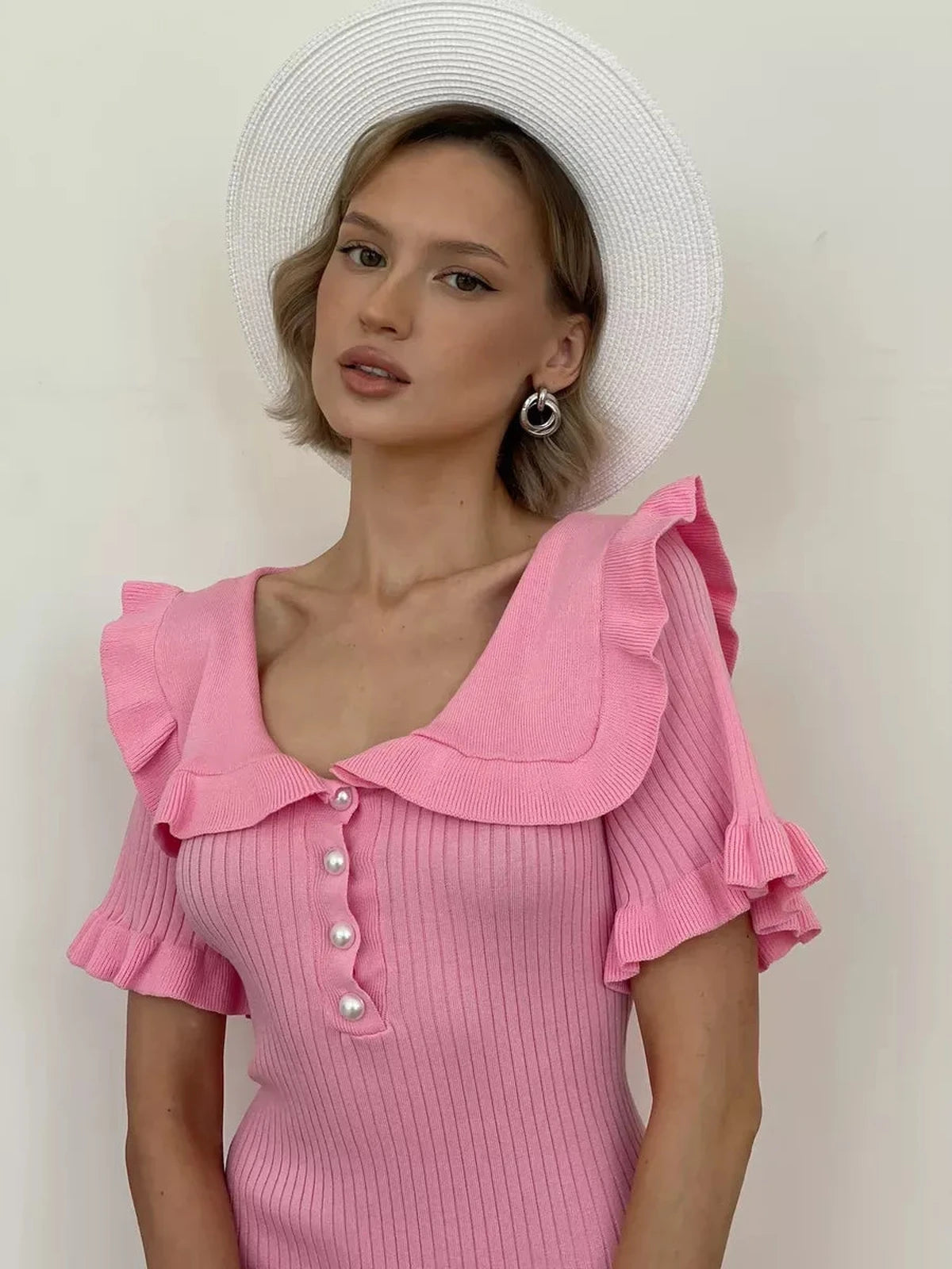 Elevate your wardrobe with the Celeste Midi Dress, a modern, fashion-forward piece that embodies luxury and timeless elegance. Crafted from 100% mercerized cotton ribbed fabric, this midi dress offers breathable comfort and a flawless semi-fitted silhouette that flatters every figure. The delicate pearl button detailing and the charming ruffled collar add a refined touch of sophistication, making it perfect for business meetings, evening strolls, or special occasions.