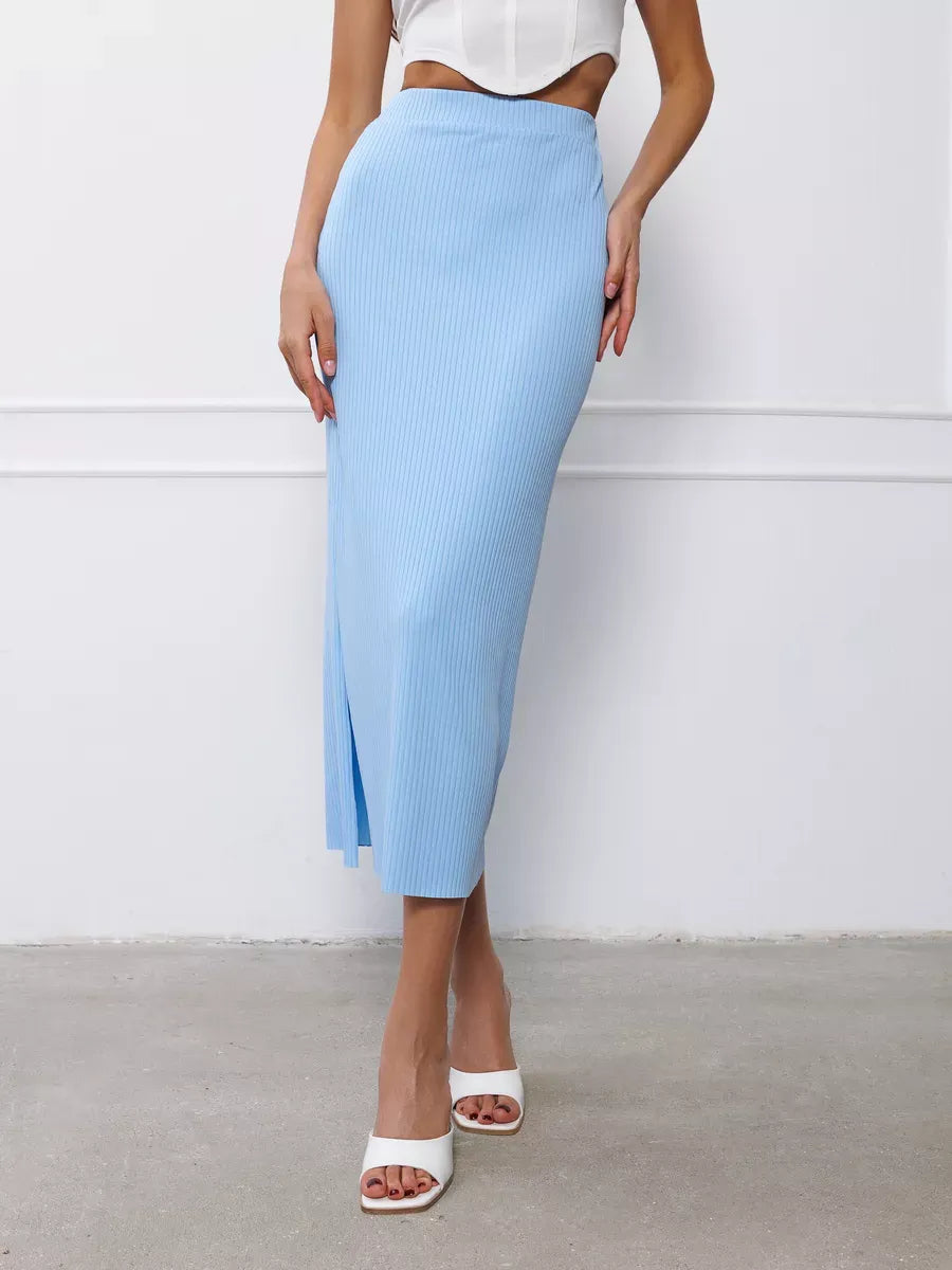 The Celeste Midi Skirt is a chic and versatile addition to any woman’s wardrobe, designed with a high waist and a figure-enhancing pencil cut. Made from premium ribbed polyester-elastane fabric, this skirt offers a soft, stretchy fit that holds its shape and provides lasting comfort. Its fresh light blue color brings a subtle pop of color while maintaining a refined, modern appeal.