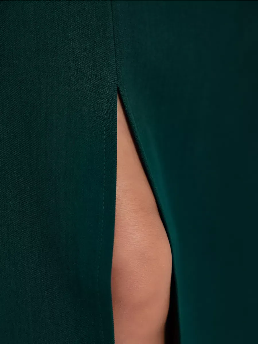 Wear this skirt with a blouse or sweater for an effortlessly chic look that transitions seamlessly from day to night. Its timeless design and rich emerald shade make it a standout piece in any wardrobe.