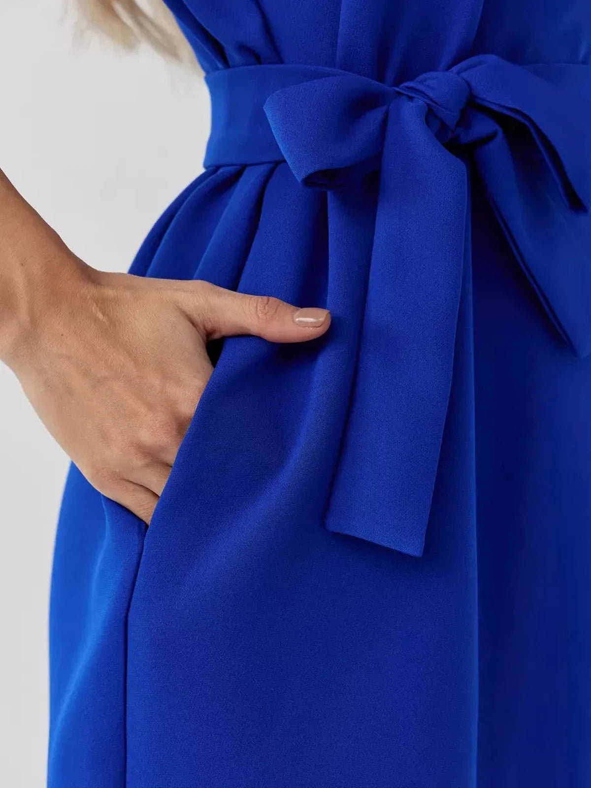This stylish dress includes a matching belt to define your waist, enhancing the overall feminine shape. The dress falls to a midi length, making it ideal for business meetings, social gatherings, or festive occasions. The discreet side seam pockets add functionality without compromising the sleek design.