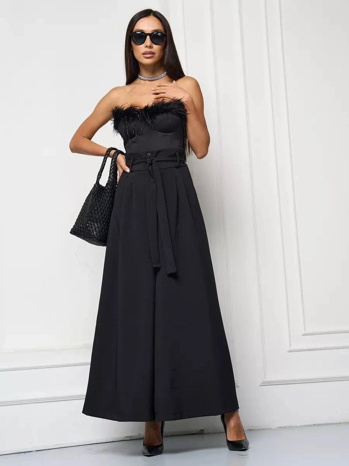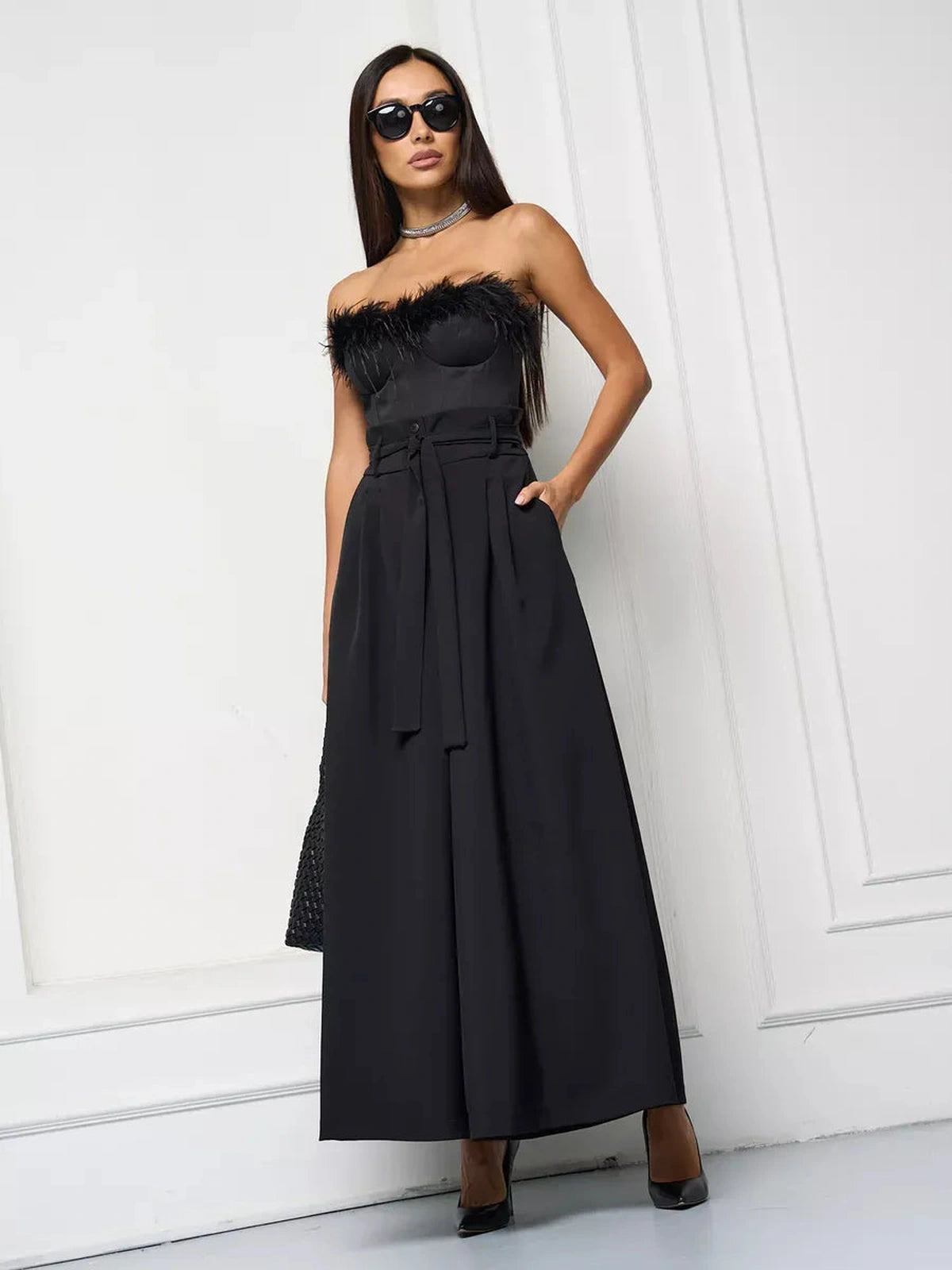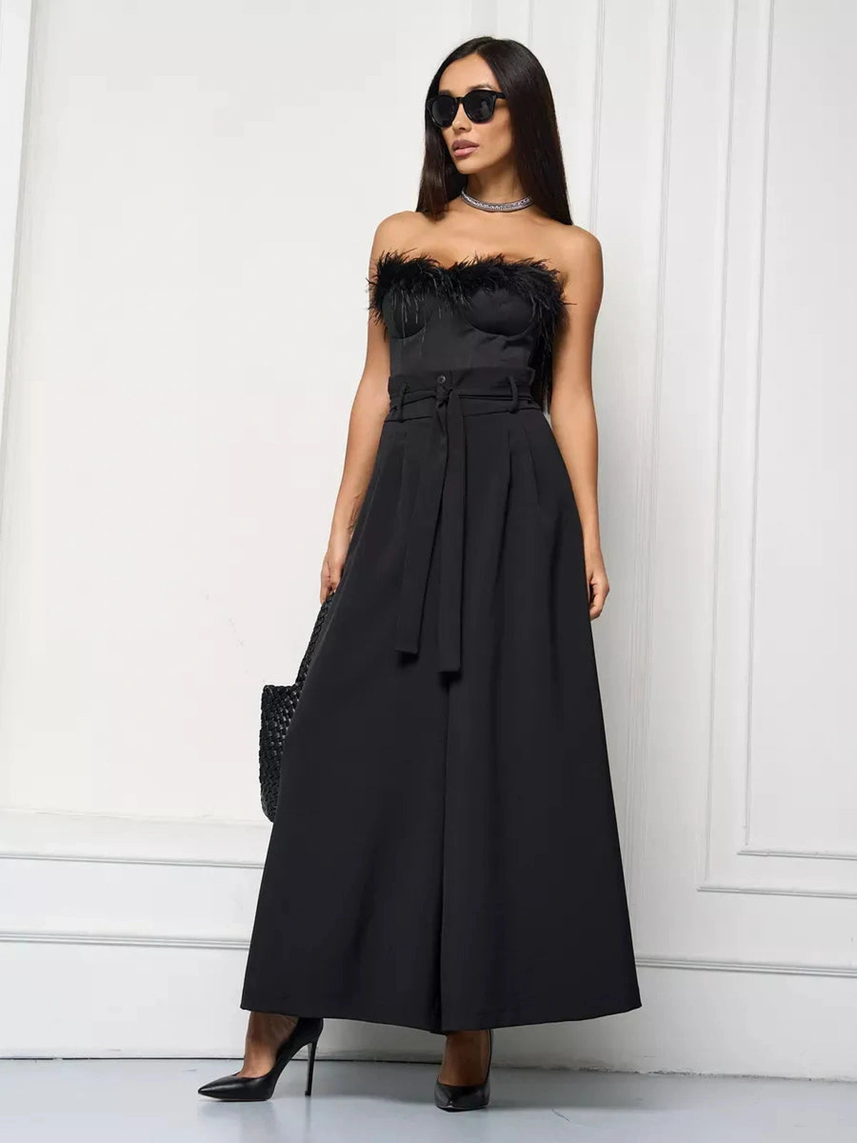 The wide-leg design of the Celeste Pants elongates the legs and enhances your posture, making them an ideal choice for both professional and social occasions. These black trousers are versatile and timeless, effortlessly complementing a variety of tops and accessories for a polished look.