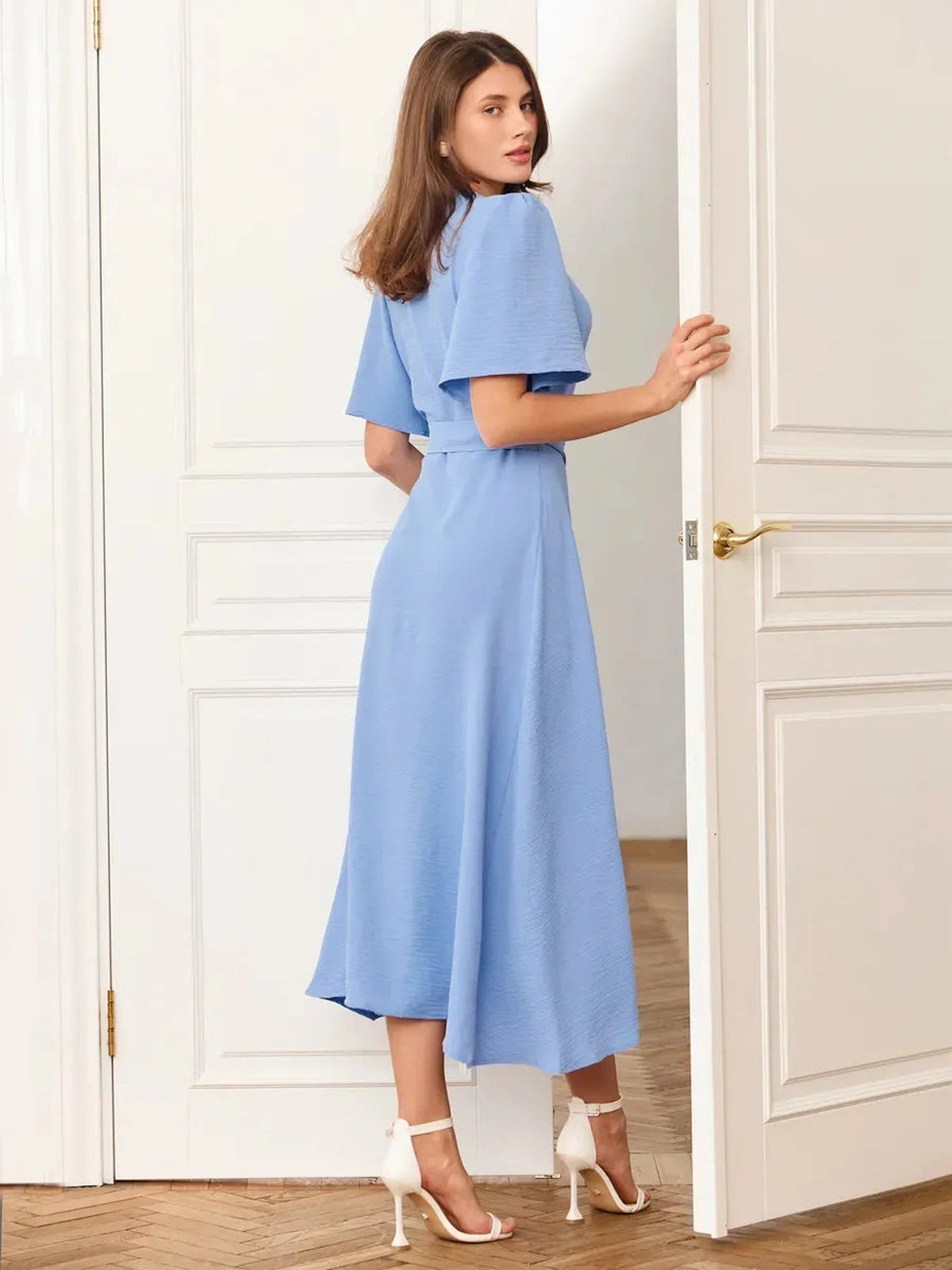 This women’s midi dress combines comfort with refined aesthetics — ideal for summer parties, wedding guest looks, or romantic evenings. Its V-neckline elongates the neckline, while flutter sleeves add a touch of modern elegance. The fluid A-line skirt moves gracefully with every step, creating a flattering flow perfect for warm-weather moments.