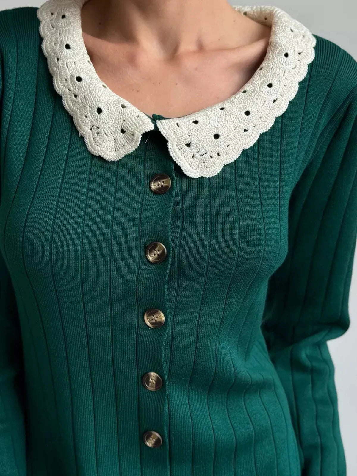 Celestine Midi Dress — Ribbed Knit Maxi Dress with Lace Collar and Button Front