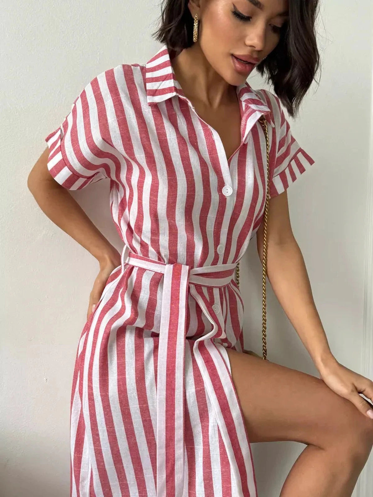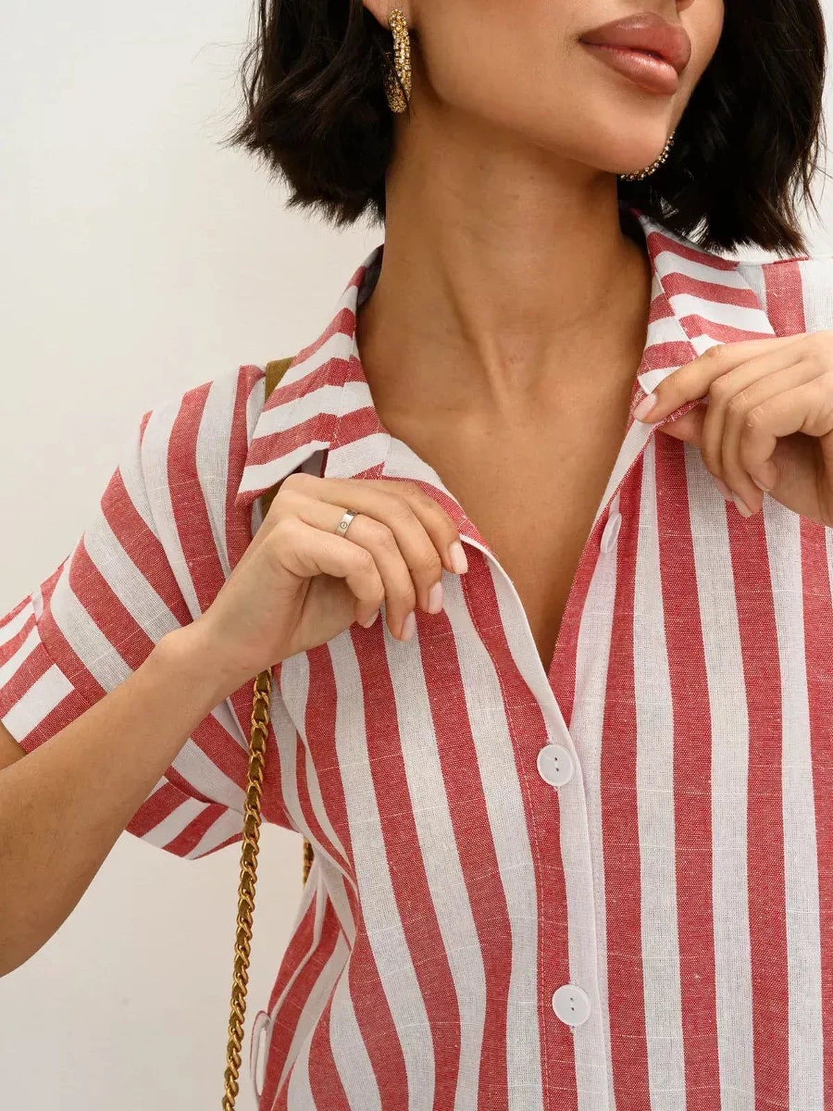 The Coral Maxi Dress is a women’s striped maxi dress designed with a timeless shirt-dress silhouette and a refined vertical stripe pattern. Crafted from a breathable cotton-blend fabric, this red and white maxi dress delivers a fresh, confident look with clean lines and a lightweight feel.