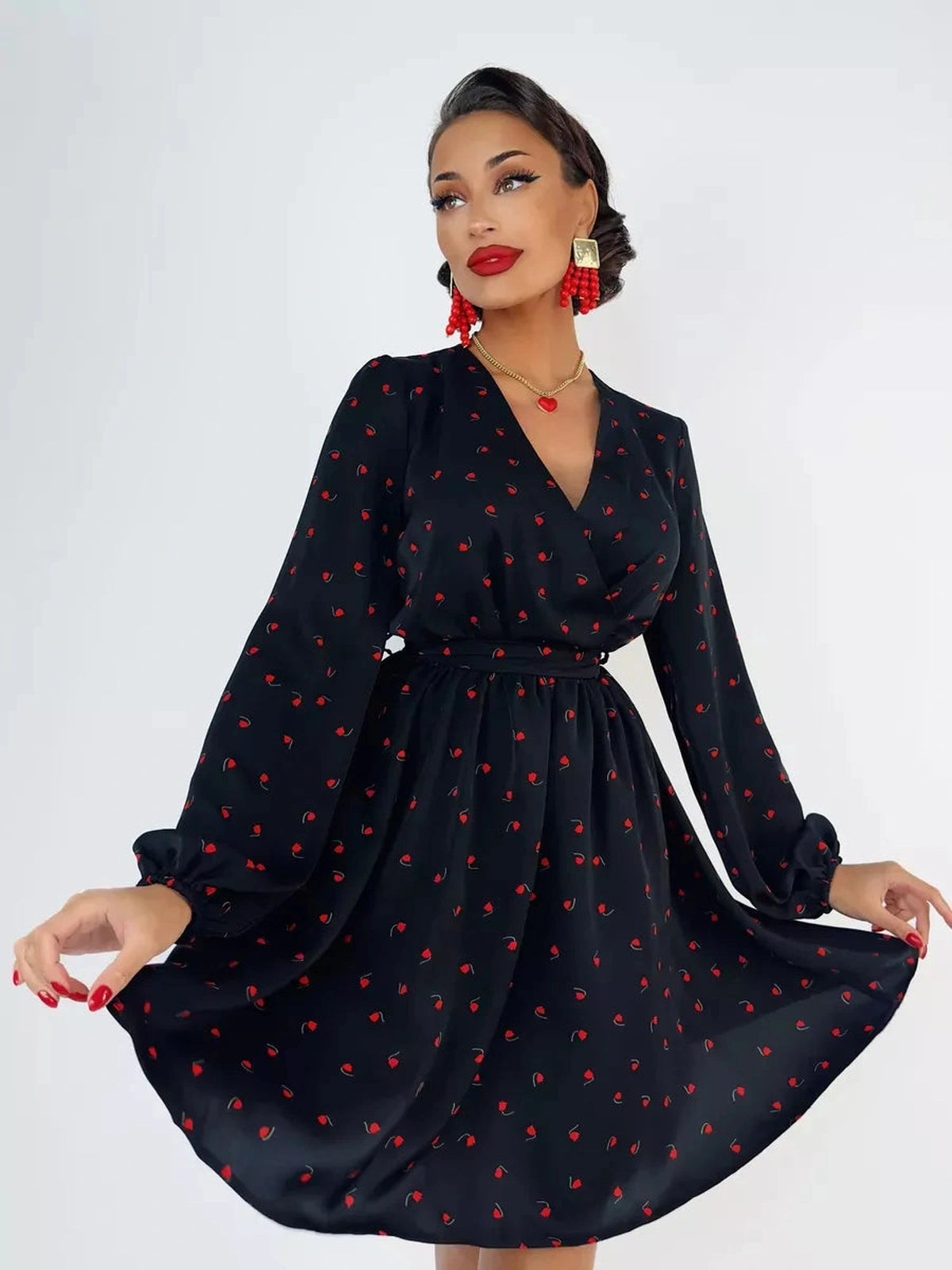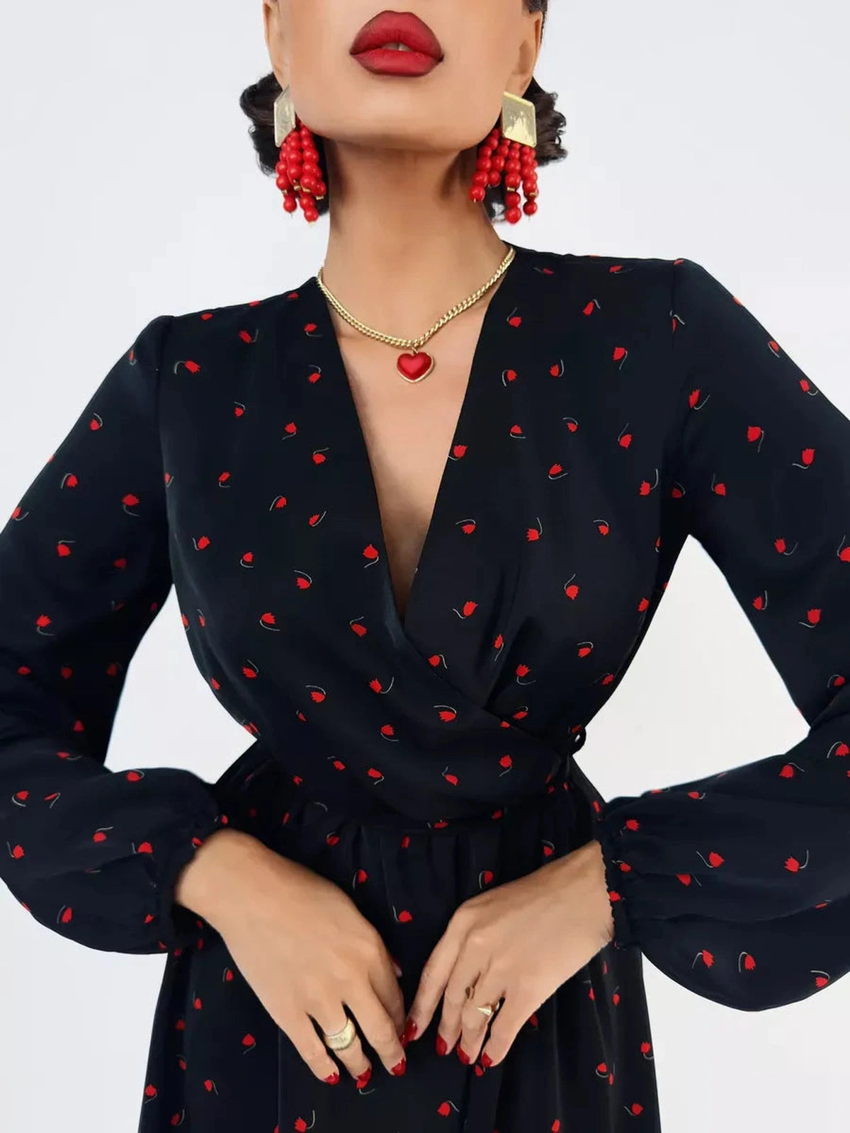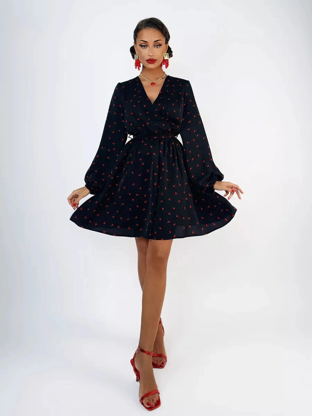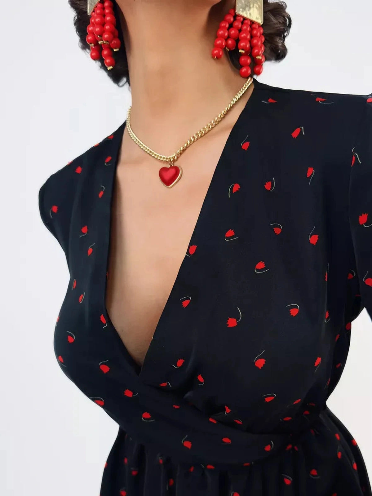 The Crimson Mini Dress features a soft and breathable fabric blend of polyester, viscose, and elastane, showcasing a sleek black base with vibrant red floral accents. This mini dress highlights a refined V-neckline and a smooth, flowing finish that embodies modern luxury and comfort.
