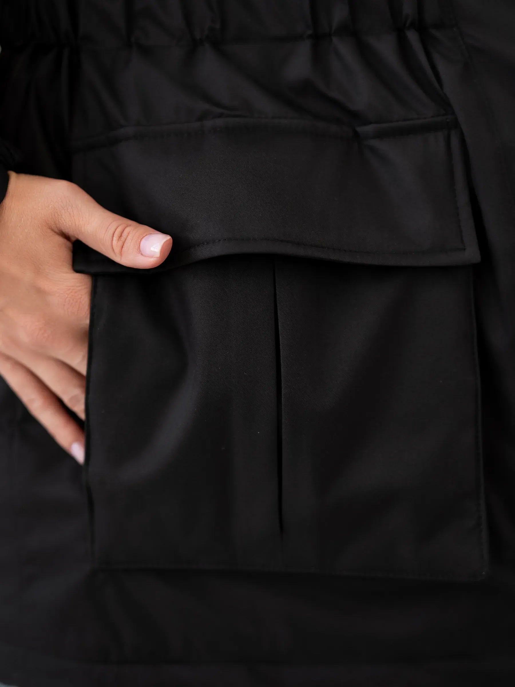 The Eden Jacket combines contemporary design with exceptional warmth, making it the perfect choice for chilly spring, fall, and winter days. Rendered in a deep matte black, this long jacket features a tailored yet comfortable silhouette that flatters all body types, from slim to plus sizes.