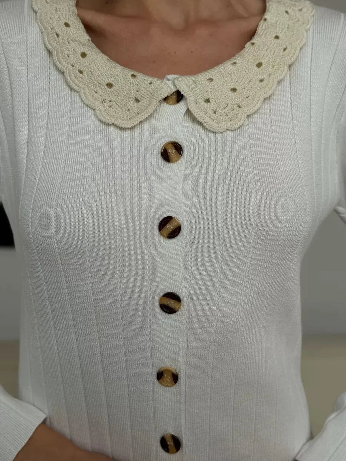 Elevate your wardrobe with the Elodie Midi Dress, a refined piece crafted from 100% mercerized cotton ribbed knit fabric that offers both comfort and sophistication. This semi-fitted maxi dress features a delicate lace collar and a full button-front design, perfectly combining vintage charm with modern elegance.