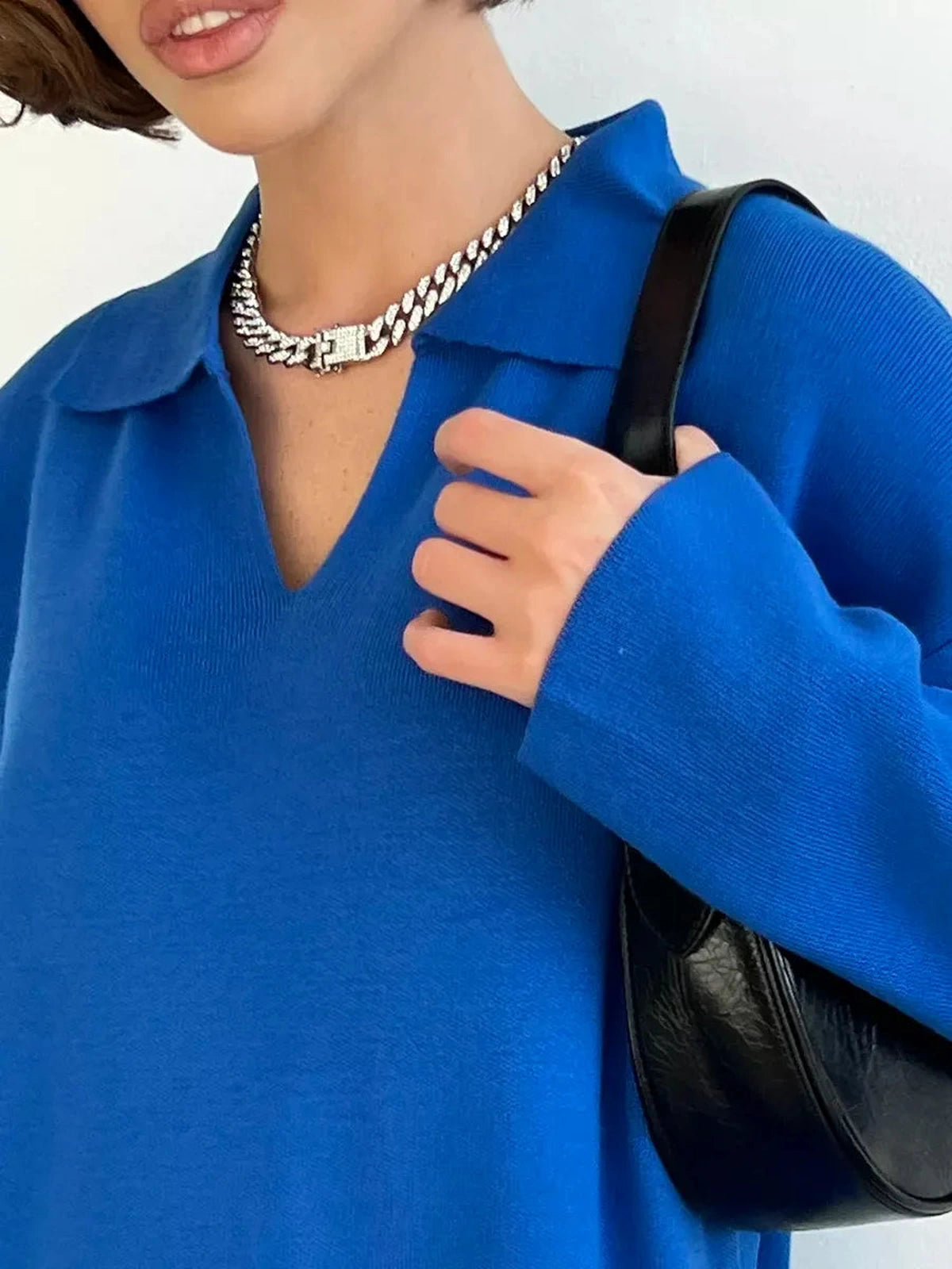 Elevate your autumn and winter wardrobe with the Indigo Midi Dress, a luxurious oversized knit dress designed for women seeking both style and warmth. This rich electric blue dress features a sophisticated V-neck collar paired with a classic polo collar detail, delivering a chic yet comfortable look. Made from a soft blend of acrylic and cotton, it offers excellent warmth and breathability for cooler days.