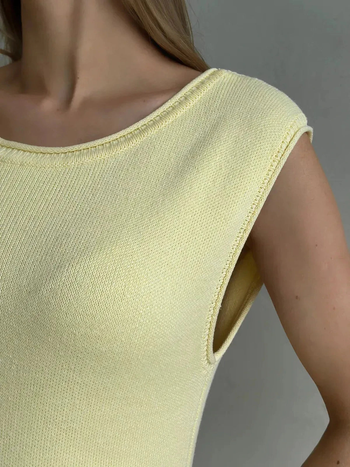 Embrace effortless elegance with the Liora Maxi Dress, a sophisticated knitted maxi dress crafted for the modern woman. Made from a breathable blend of 70% cotton and 30% acrylic, this sleeveless dress features a straight, flowing silhouette that gently skims the body for a flattering fit. The soft pale yellow shade adds a fresh, sunny vibe perfect for warm weather occasions.
