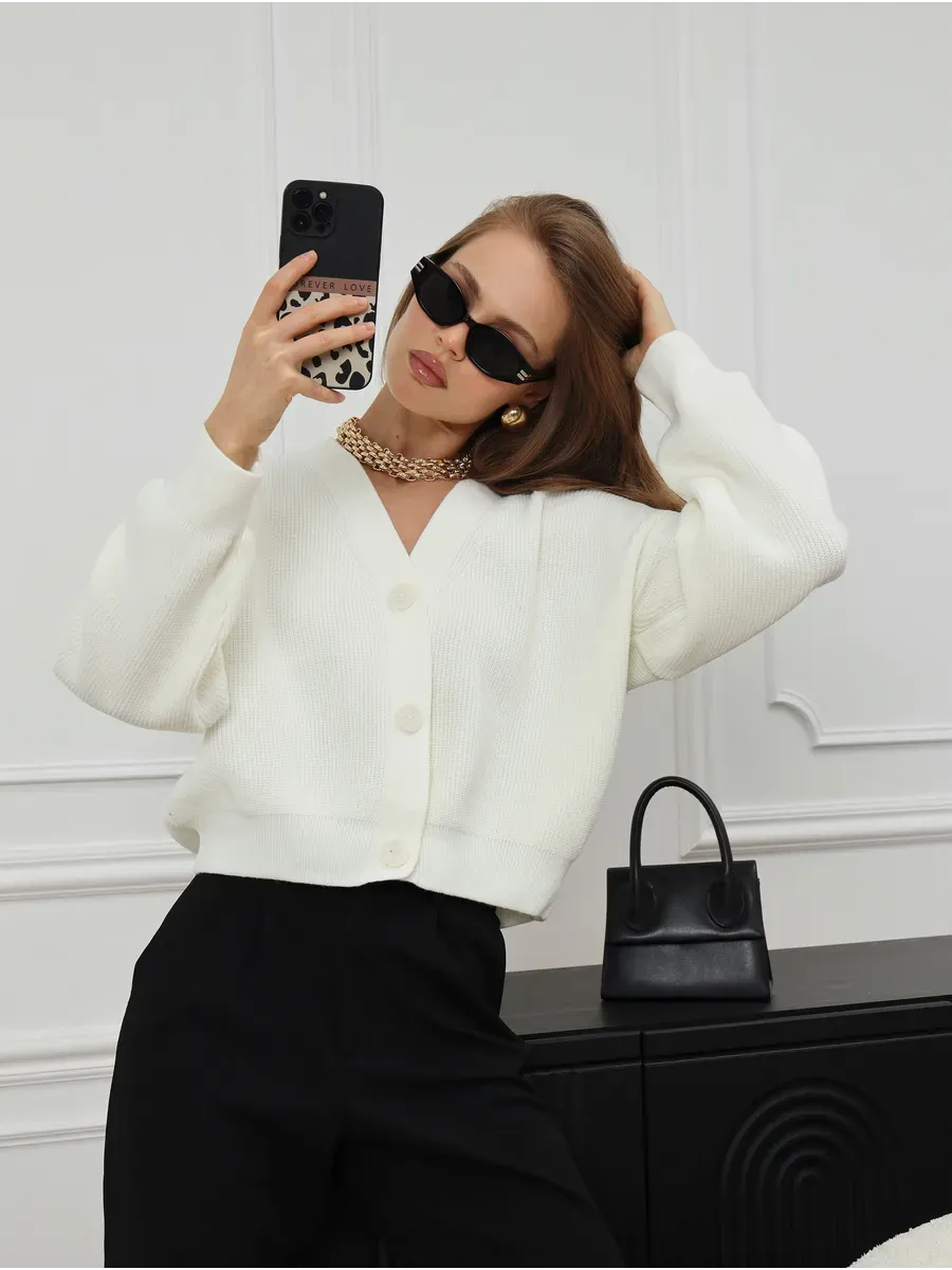 The Lyra Cardigan is a modern essential designed for women who appreciate timeless elegance and versatile style. Crafted in a soft oversized silhouette, this knitwear piece offers both comfort and sophistication. Its cropped length and wide sleeves bring a youthful energy, while the deep V-neckline and button closure enhance its refined look.