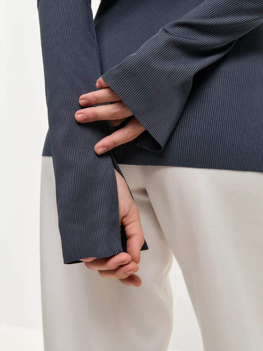 Designed with long, flared sleeves and a tailored silhouette, the Lyra Pullover creates a sleek and modern look. The bottom slit and delicate shoulder cutouts introduce an element of contemporary style, making this piece perfect for work, casual outings, or upscale evening events.