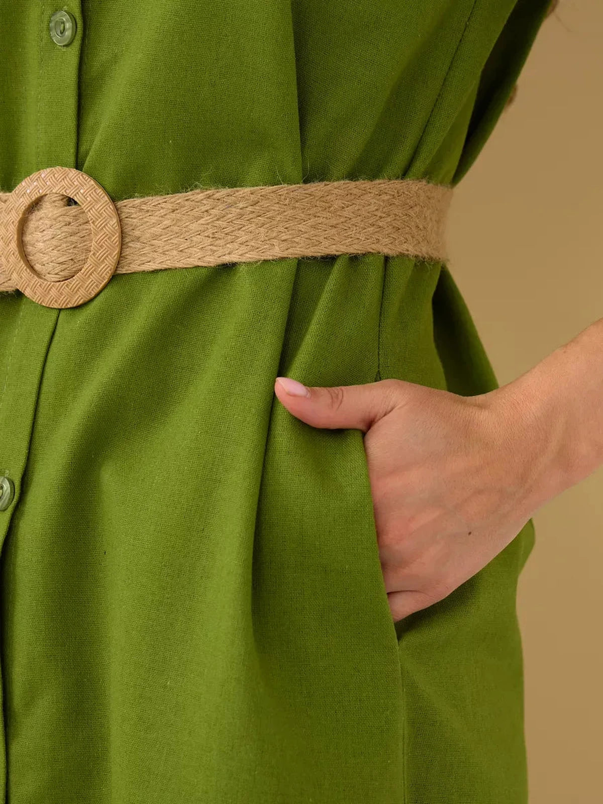 Complete with a natural woven belt that accentuates the waist or can be removed for a relaxed oversized fit, this dress includes decorative chest pockets, functional side pockets, and side slits for added movement and flair.