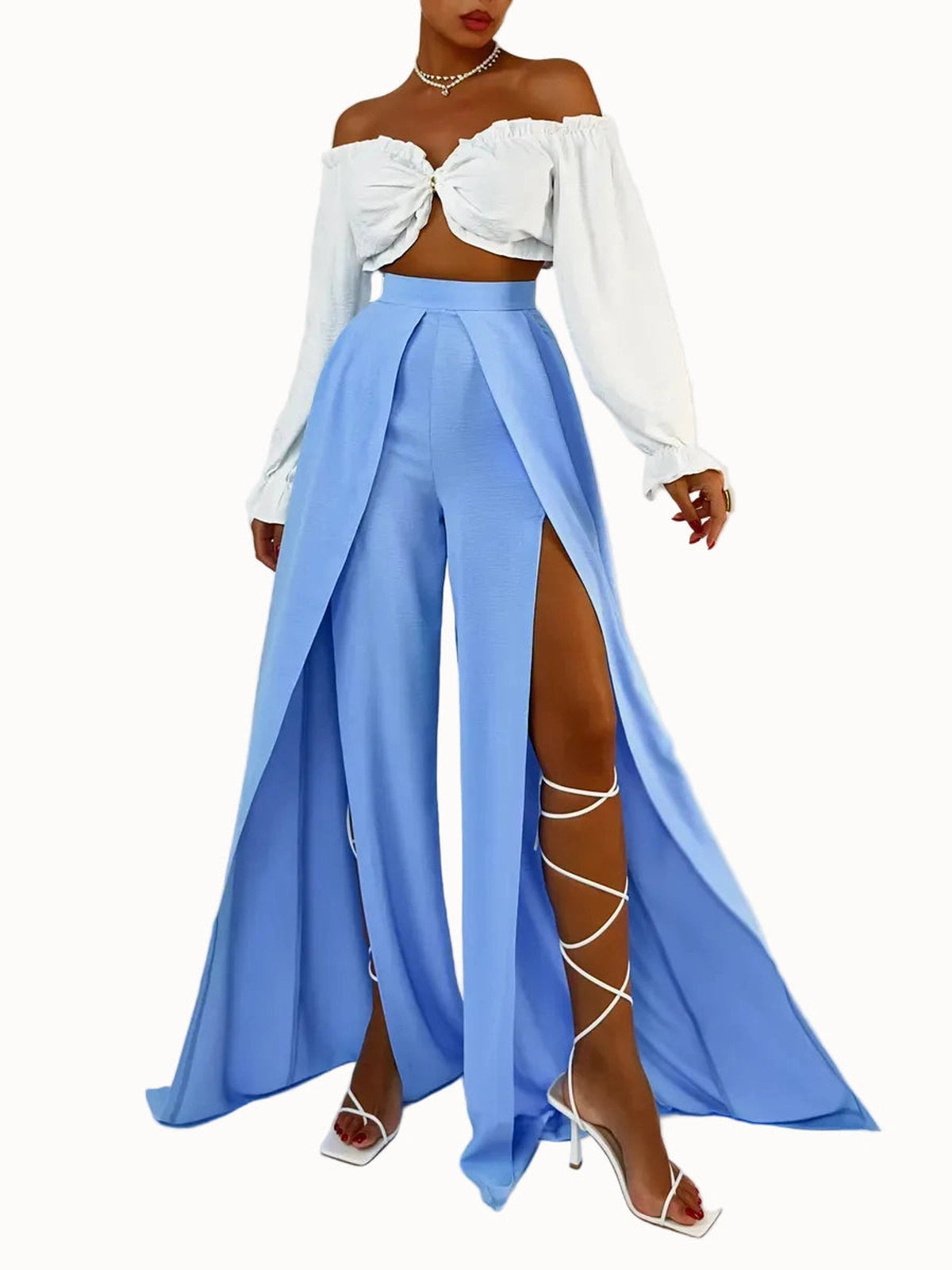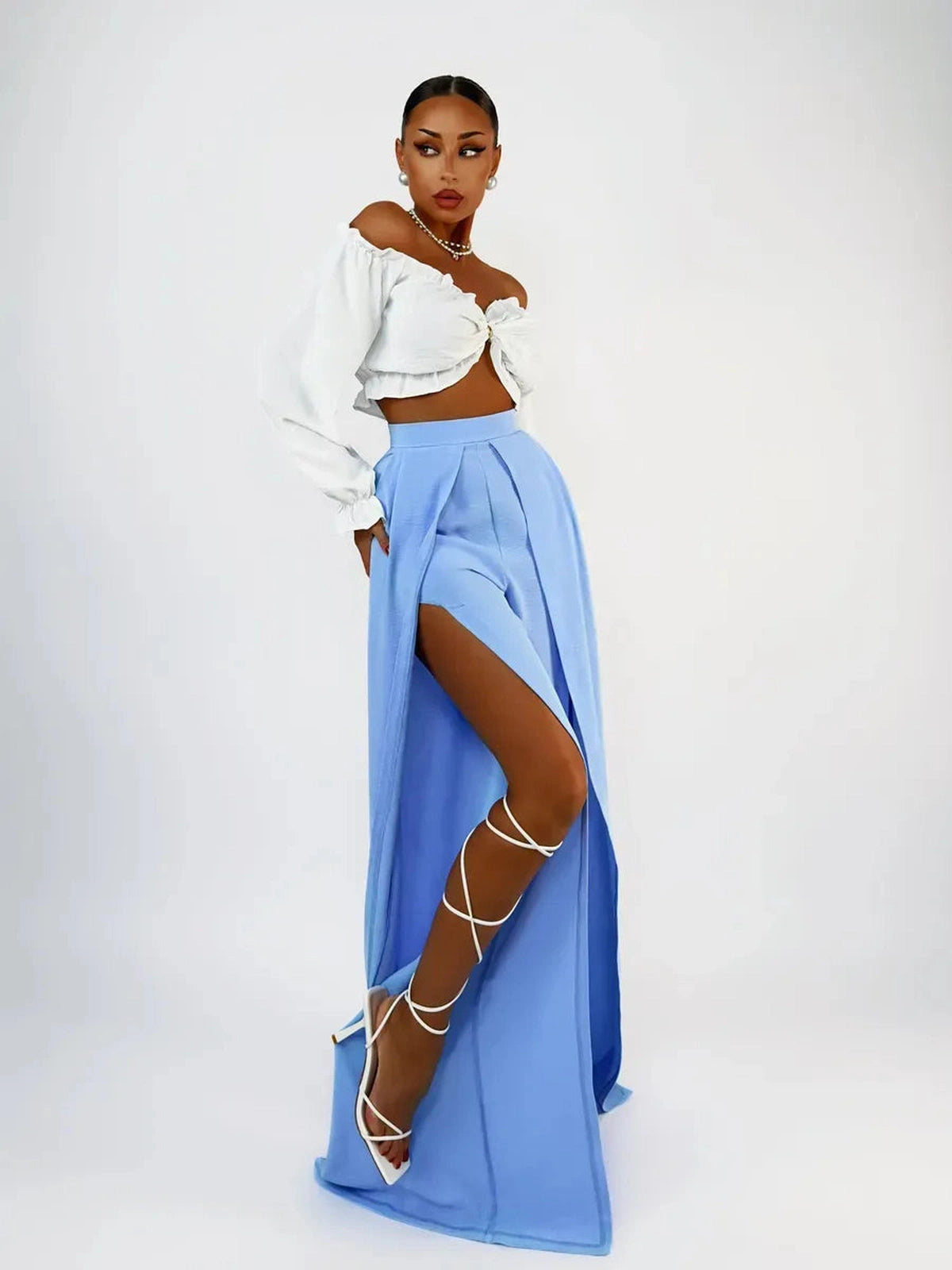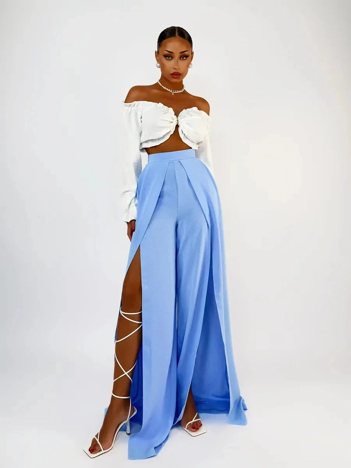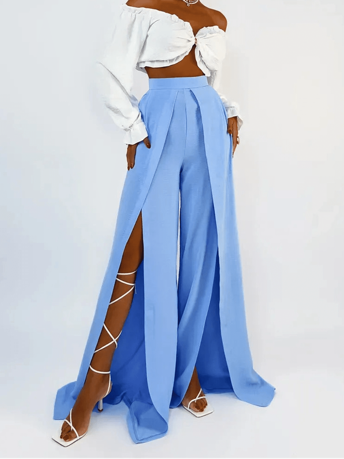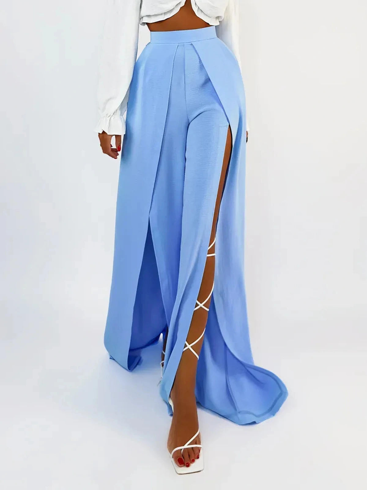 Elevate your wardrobe with the Maris Pants, designed for modern women who value both style and comfort. These wide-leg trousers boast a high waist that enhances your silhouette and adds a sleek, elongated effect to your legs. The striking front slits offer a contemporary twist, bringing movement and sophistication to your look.