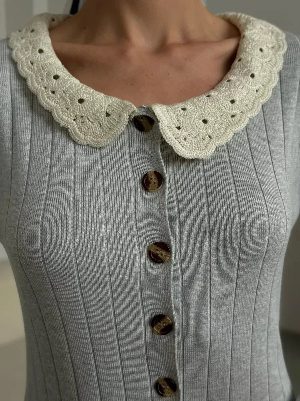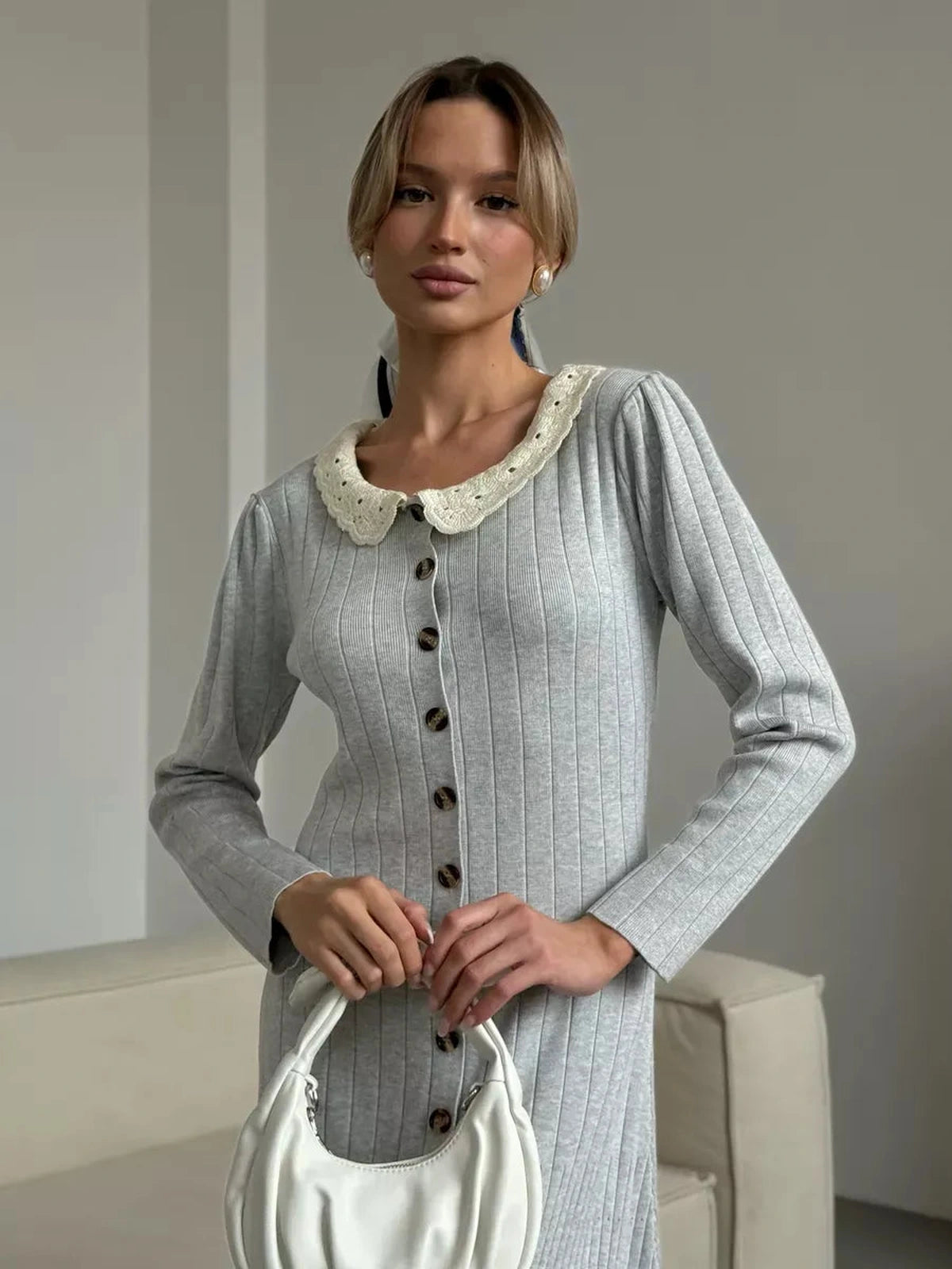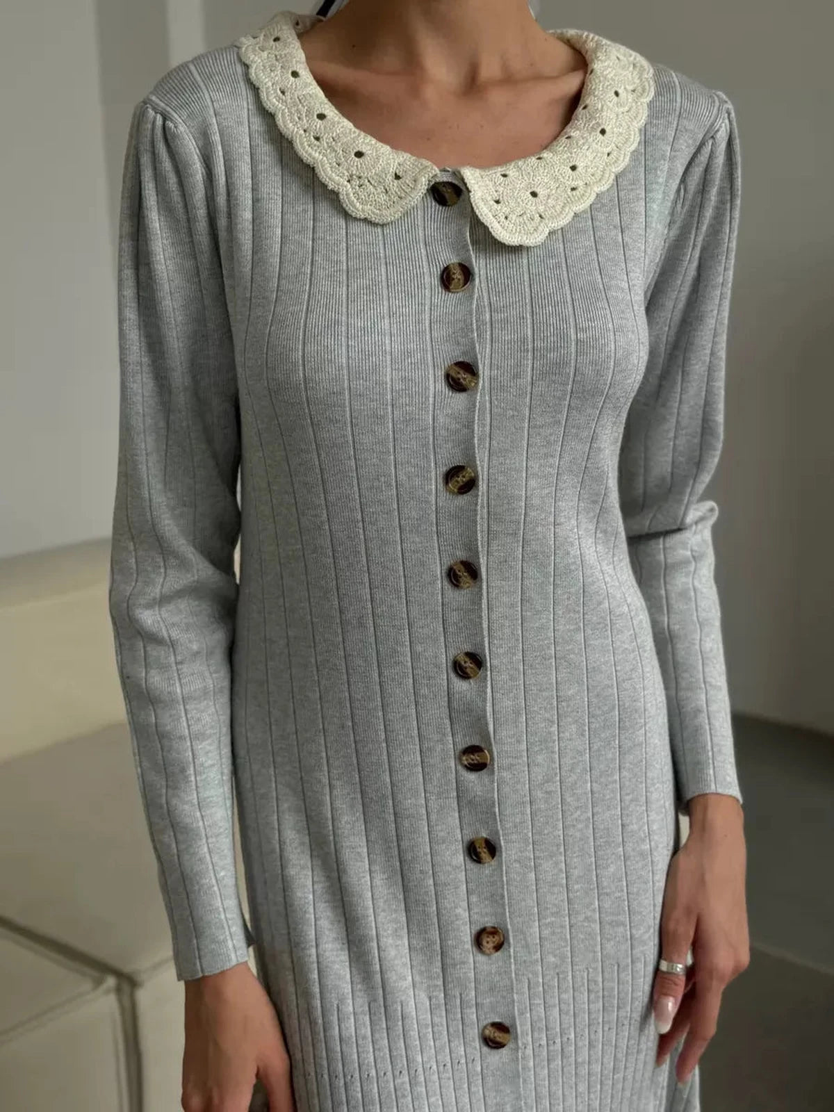 This exquisite dress features a delicate lace collar that adds a touch of vintage charm and femininity. The full button-front closure with elegant tortoiseshell buttons enhances its classic appeal, while long sleeves and a round neckline balance the graceful maxi length for versatile wear.