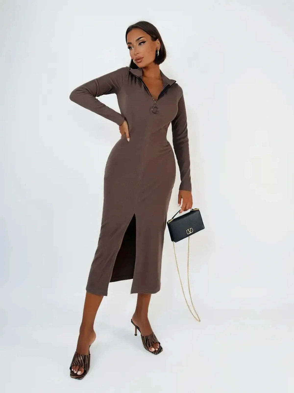 Featuring a stand collar with a stylish zip closure that comes with a ring or heart-shaped pull, this dress combines modern design with timeless sophistication. Long sleeves with thumb slits add an extra touch of comfort and style. The midi length and front slit provide freedom of movement while maintaining a sleek, flattering fit, perfect for a variety of body types including maternity wear.