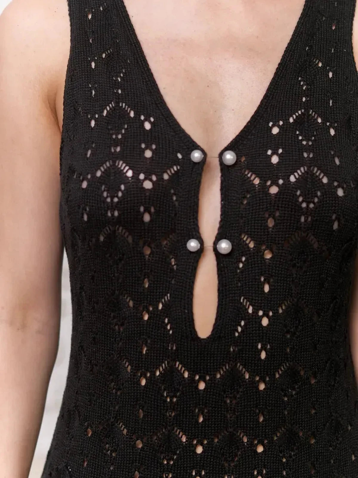 Whether worn for a relaxed day by the water or an elegant summer evening, the Noir Maxi Dress promises a refined look with understated charm. Its elegant black hue enhances the delicate knit pattern and decorative details, creating a striking piece you'll reach for season after season.