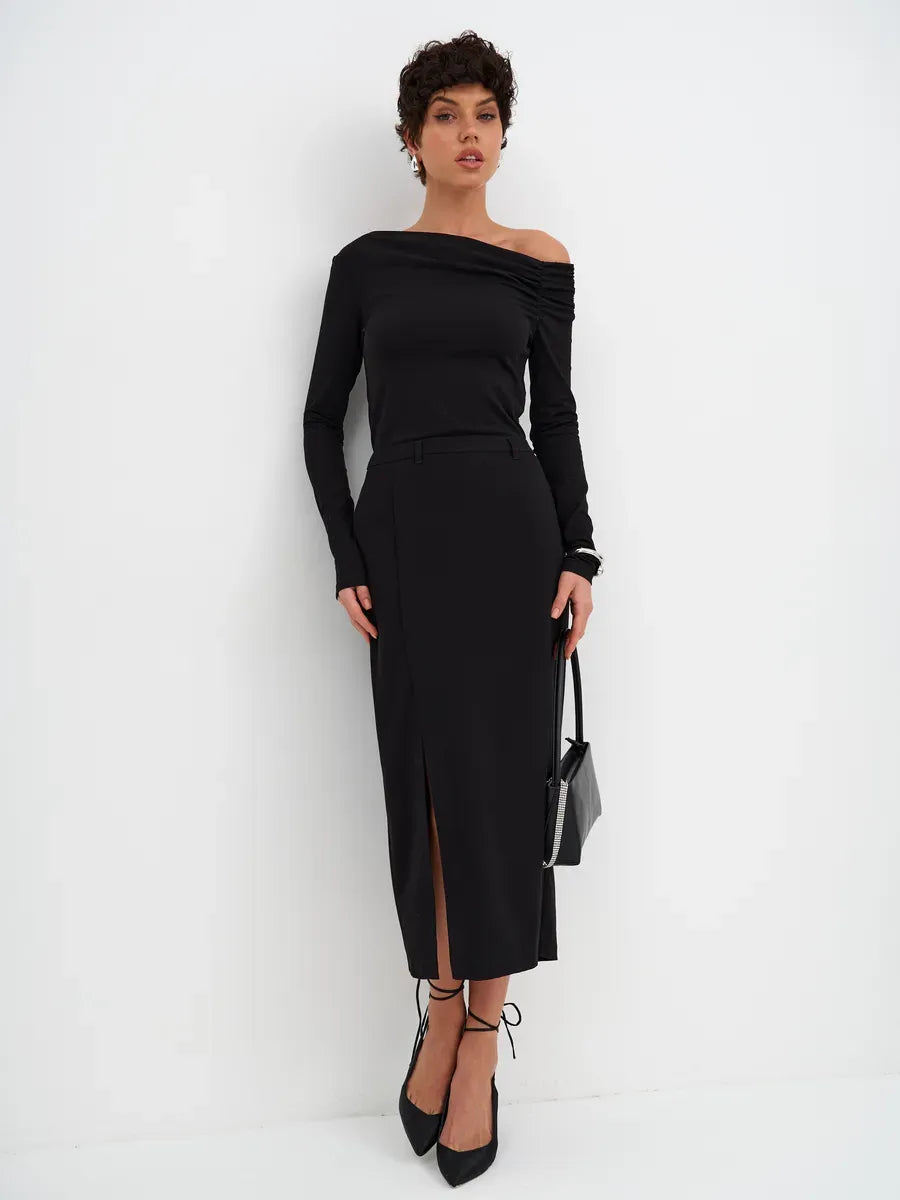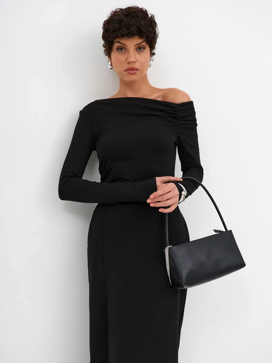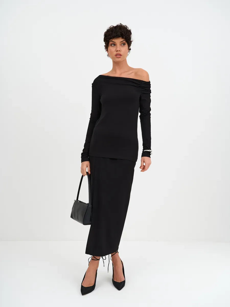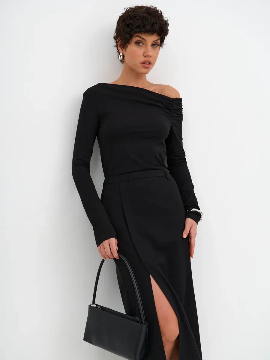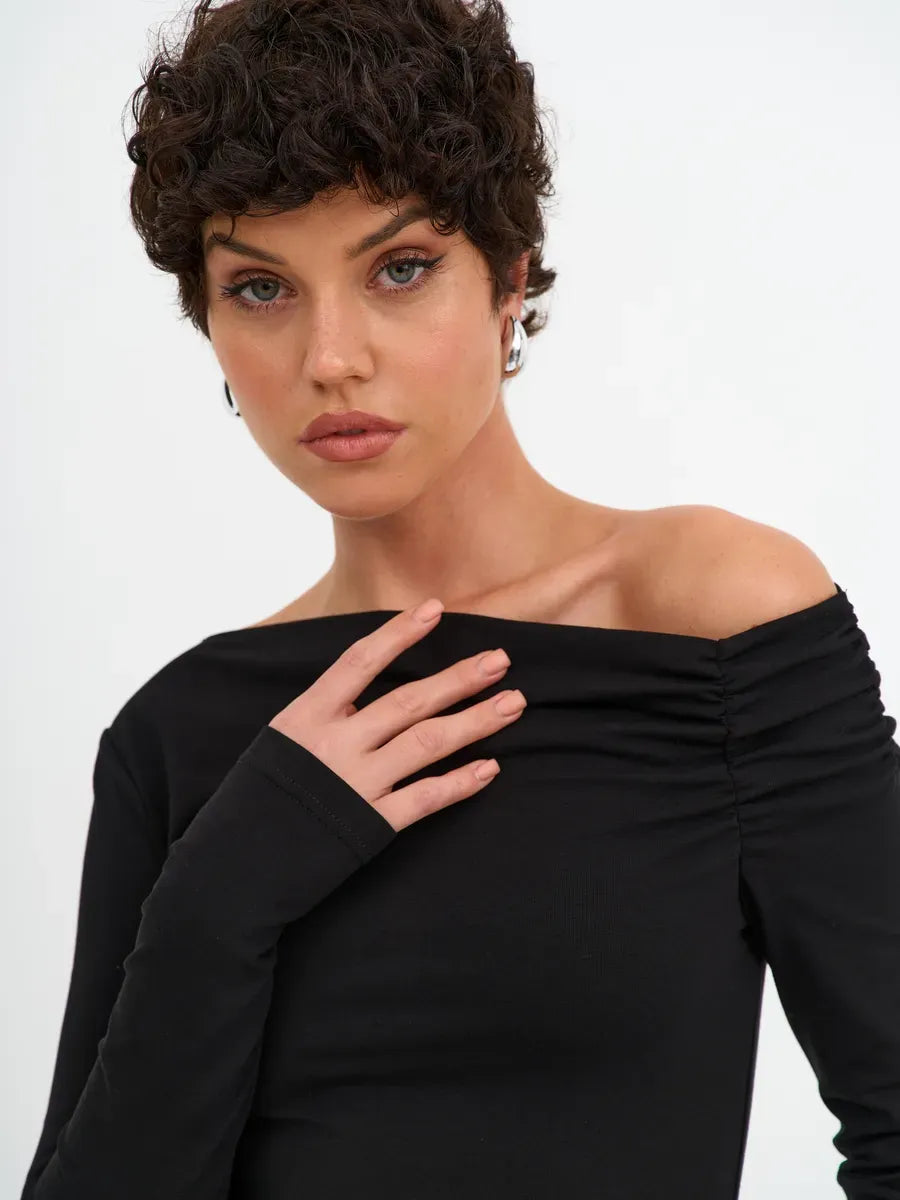 The Noir Pullover embodies refined minimalism and elevated style. This asymmetric long-sleeve pullover is crafted from a premium cotton blend with a hint of stretch, designed to contour the body while maintaining ultimate comfort. Its signature off-shoulder silhouette and delicate draping along the neckline create a subtle yet striking statement, ideal for the modern woman’s wardrobe.