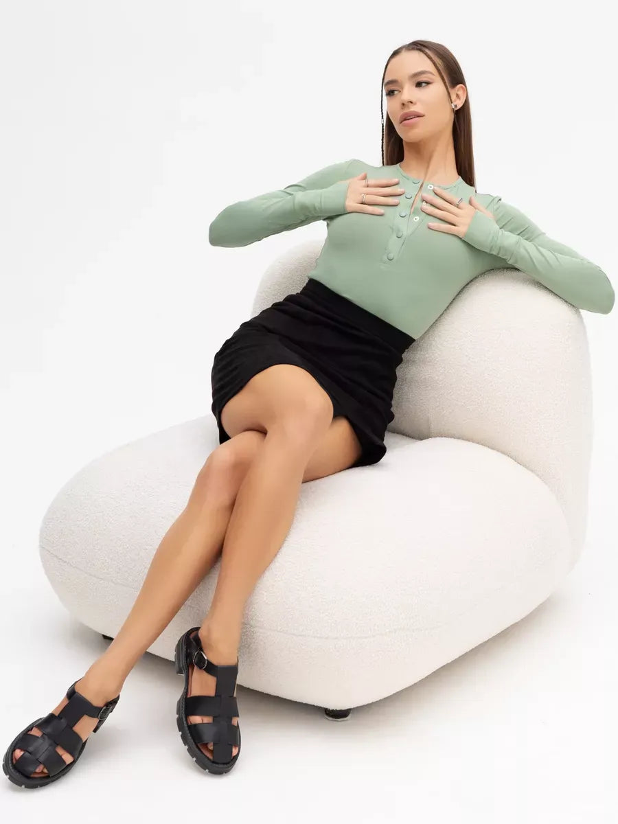 Refresh your wardrobe with the Olive Pullover, a fitted long-sleeve top crafted from a high-quality blend of 92% cotton and 8% elastane. This olive green pullover offers breathable comfort and gentle stretch for a flattering fit that moves with you. The trendy thumbhole sleeves add a sporty edge while highlighting elegant wrists, perfect for layering or wearing alone.