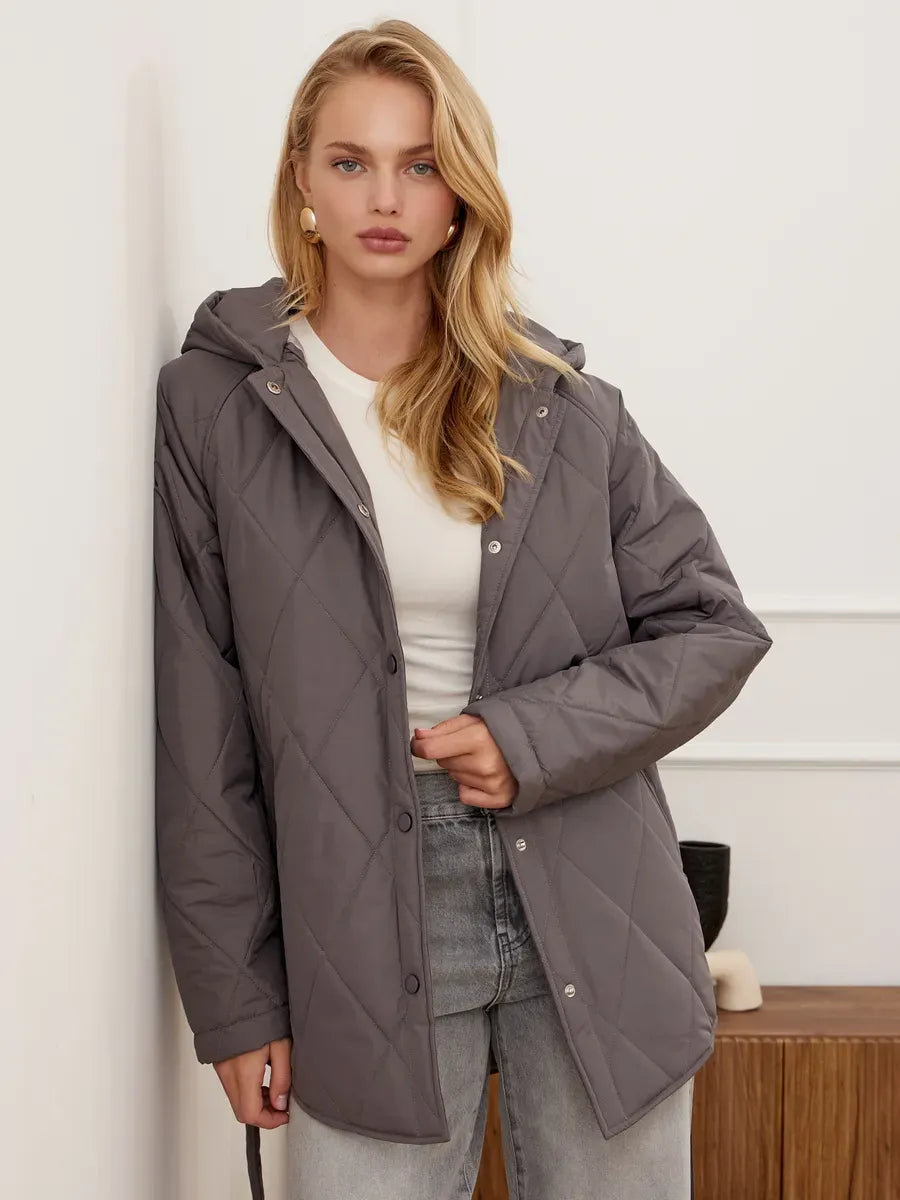 The fitted silhouette is enhanced by an adjustable waist belt that creates a flattering shape, while the diamond quilted pattern adds texture and timeless style. A non-removable hood provides extra coverage, and practical slit pockets offer convenience without compromising the streamlined look. The snap-button closure completes this versatile and chic piece.