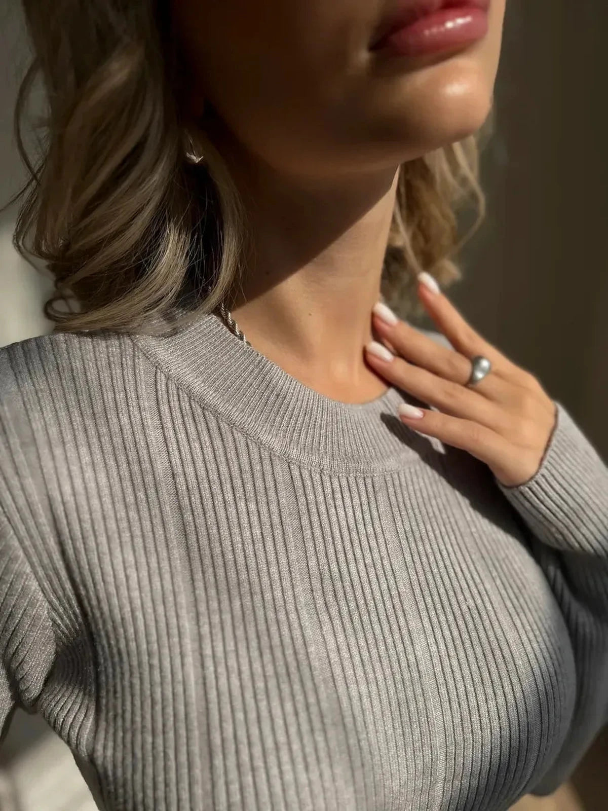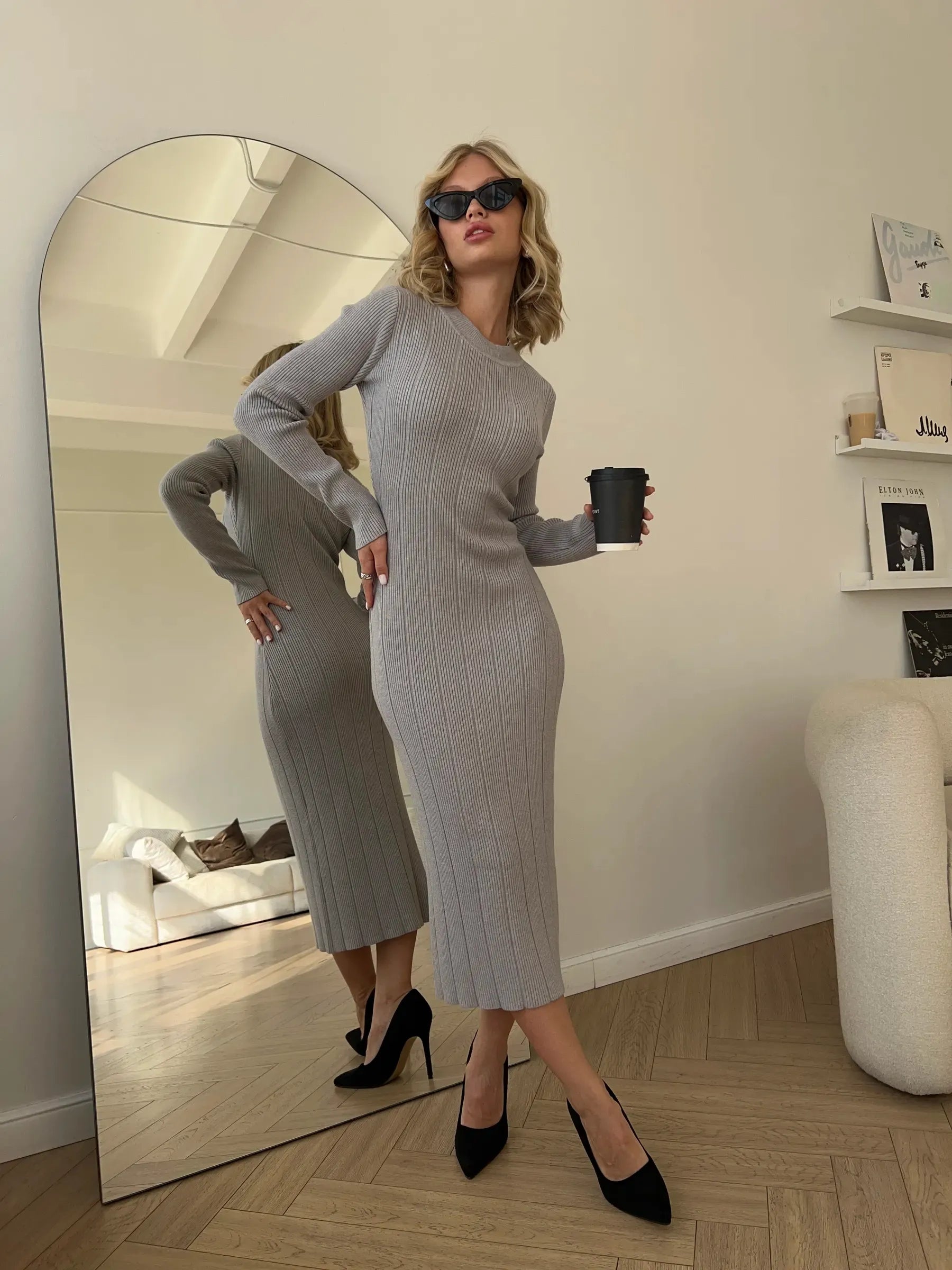 The ribbed texture adds refined detail while ensuring a flattering fit that contours the body with ease. The dress falls below the knee, perfect for both casual and dressier occasions, effortlessly transitioning from day to night.