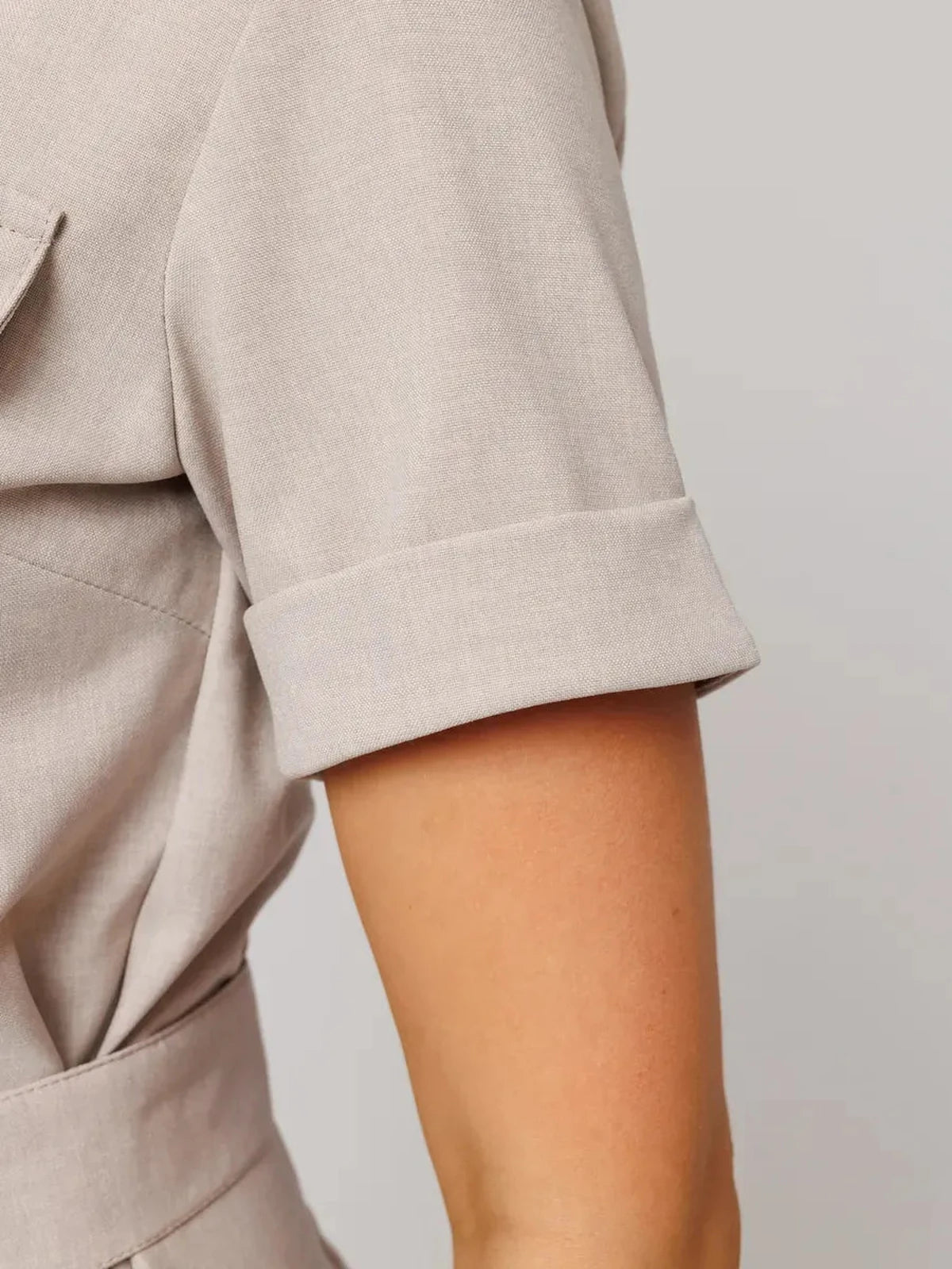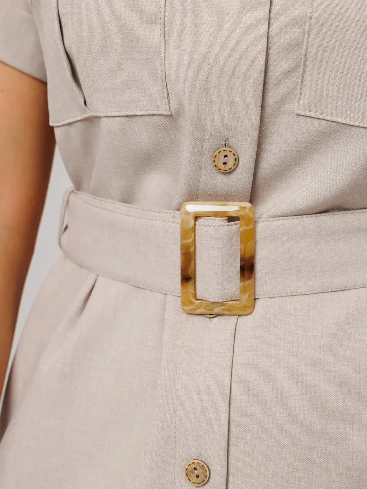 Perfectly tailored with a classic shirt collar, rolled short sleeves, and flap chest pockets, the Vela Midi Dress reflects a versatile safari-inspired aesthetic ideal for both office wear and casual outings. Its breathable fabric and thoughtful cut make it an excellent option for warm weather while maintaining a polished look for various occasions.