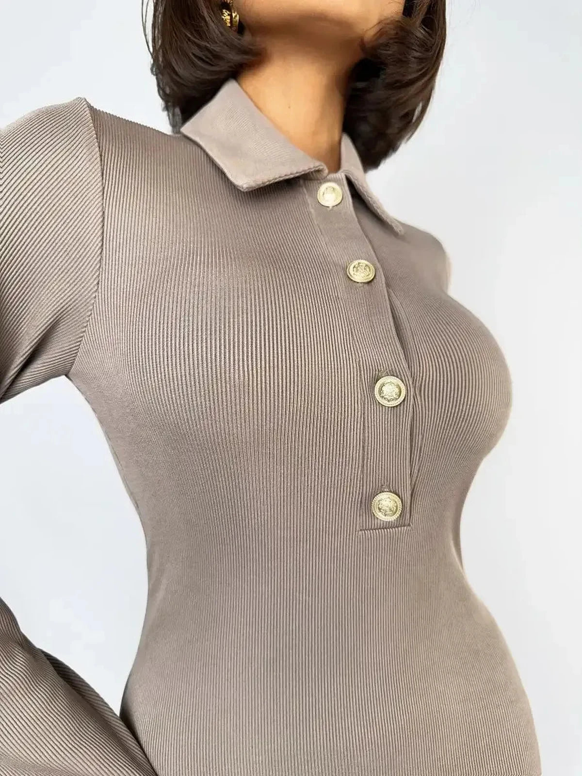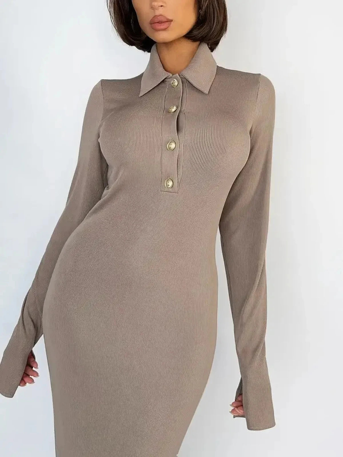 The deep V-neckline framed by a structured collar creates a graceful, elongated line, enhanced by glossy statement buttons that introduce a subtle vintage touch. This elegant long sleeve maxi dress offers a smooth, flattering drape, supported by soft stretch fabric that maintains shape without restricting movement.