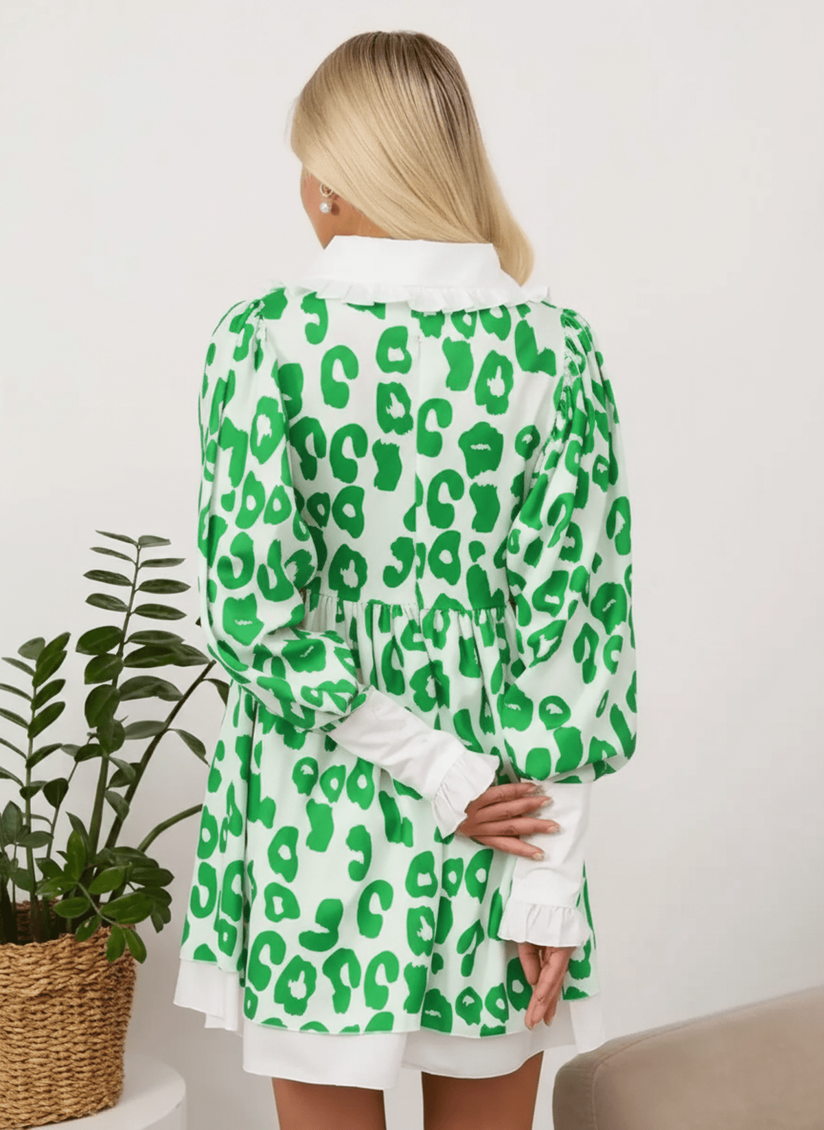 The Viera Mini Dress features a playful cotton-polyester blend fabric adorned with bold green leopard spots on a crisp white background. This oversized baby doll style dress highlights a large white ruffled collar and long sleeves with matching cuffs, delivering a fresh and lively look.