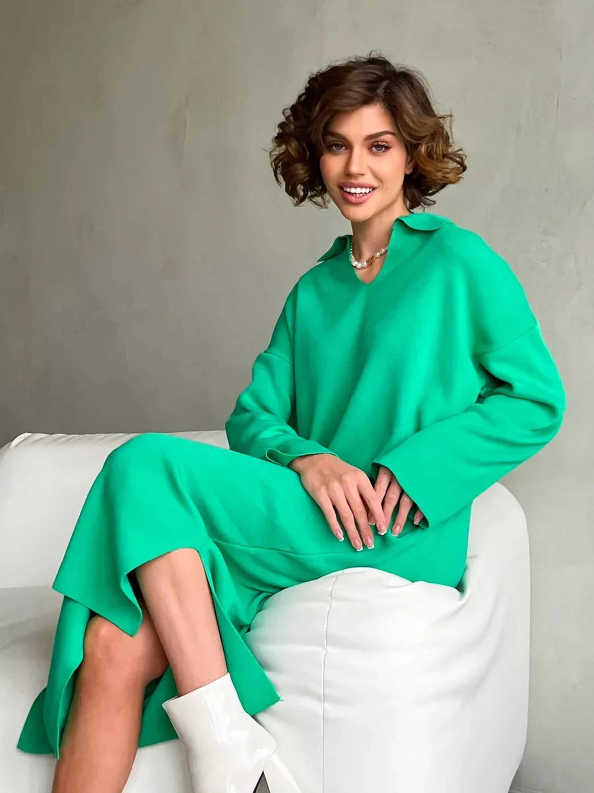 Featuring a flattering V-neck collar with a subtle polo-inspired design, long loose sleeves, and a mid-length silhouette with side slits, this dress balances ease of movement with sophisticated style. Its oversized cut suits a range of body types, including expectant mothers, delivering comfort without sacrificing fashion-forward appeal.